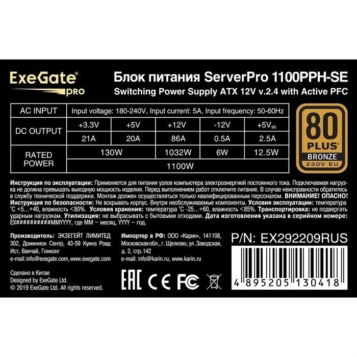 Блок питания ATX Exegate ServerPRO 80 PLUS Bronze 1100PPH-SE
