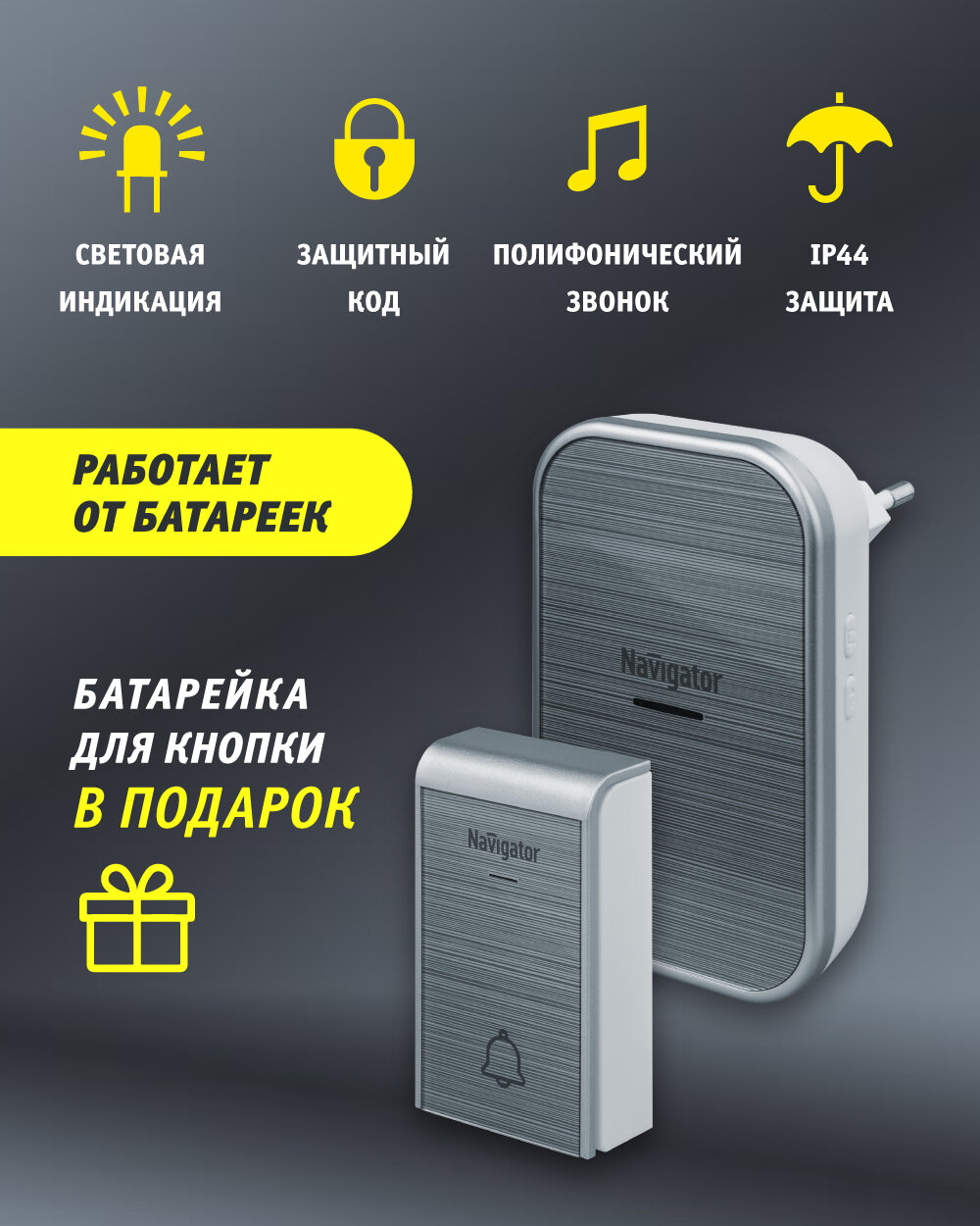 Звонок Navigator серии NDB – современное беспроводное устройство подачи звукового и светового сигналов. Конструкция позволяет легко установить его в любом помещении или на загородном участке, быстро переместить при необходимости, настроить комфортную громкость и выбрать мелодию.