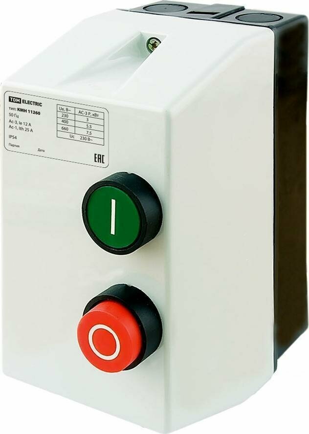 Назначение: Дистанционный пуск и остановка трехфазных асинхронных электродвигателей с короткозамкнутым ротором на напряжение переменного тока до 400 В. Защита электродвигателей от перегрузок недопустимой продолжительности и сверхтоков, возникающих при обрыве одной из фаз. Применение: Контакторы КМН в сборе с электротепловым реле в защитной оболочке являются комплектным устройством. Оболочка со степенью защиты IP54 позволяет использовать контактор на строительных площадках, в лакокрасочных, термических и гальванических цехах, Контакторы КМН 10910 – КМН 23211 применяются в пластиковой оболочке, контакторы КМН 34012 – КМН 49512 – в металлической. Конструкция: Заводская схема управления позволяет избежать ошибок при подключении на месте и сокращает время монтажа. При управлении активными нагрузками (нагревательные цепи, цепи освещения), рациональнее применять схему управления на 230 В.