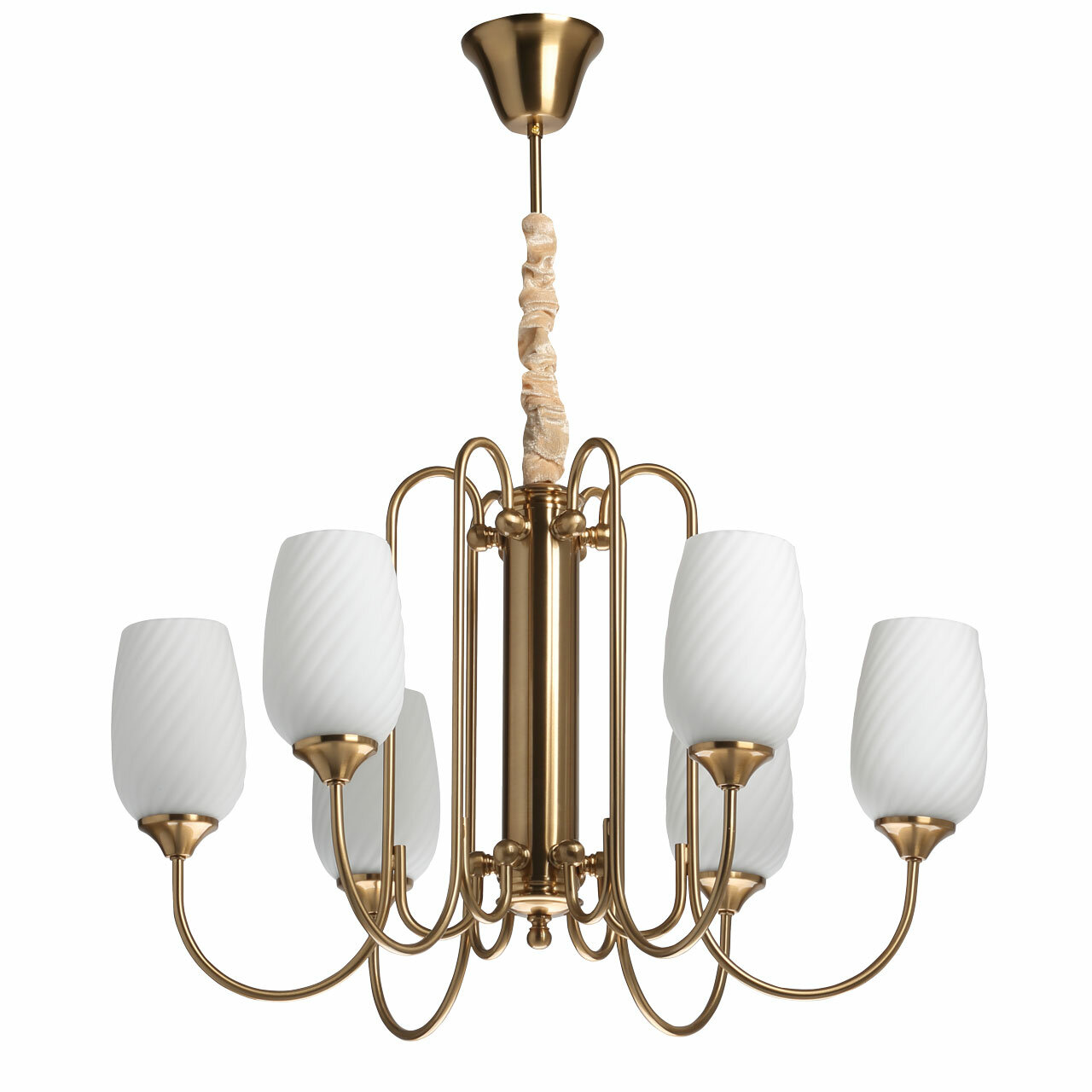 Металлическое основание светильника гальванизировано в цвет бронзы. Стеклянные плафоны молочного цвета с добавлением глушителей прозрачности отлиты в сложную форму, создающую спиралевидный рисунок.