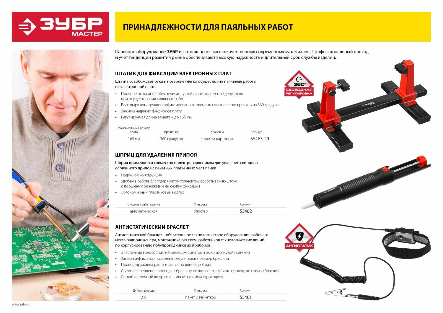 ПреимуществаВысококачественный пластик.Облегченный корпус, для удобства работы.ОписаниеПаяльное оборудование ЗУБР изготовлено из высококачественных современных материалов. Профессиональный подход и учет всех тенденций развития рынка обеспечивают высокую надежность и длительный срок службы.ПрименениеШприц применяется совместно с электропаяльником для удаления свинцово-оловянного припоя с печатных плат и иных мест пайки. Удобен в использовании благодаря автоматическому срабатыванию штока с поршнем при нажатии на кнопку фиксатора.Артикул Материал пластик