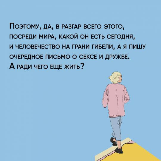 Несмотря на какую-то необязательность, все эти скучные имейлы действительно, не смейтесь, заставляют задуматься. Салли Руни не дает конечного ответа, а лишь рассуждает и набрасывает, а уже читатель должен сам сформулировать конечное отношение к поднимаемым темам. И я представляю как загораются лампочки над головами молодых людей, которые раньше не задумывались о возможности благодарить Бога просто так, без покаяний, о разделении личности автора и его произведений, о современных книгах, в которых нет настоящей жизни, поскольку писатели все меньше живут и все больше стонут, что их не позвали туда-то и не вручили премию там-то. Очень полезно, когда читаешь только список бестселлеров «Нью-Йорк таймс».
