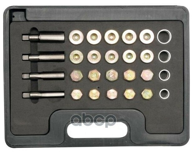 Набор предназначен для ремонта поврежденных масляных пробок. Набор для четырех типов ниток: M13, M15, M17, M20. Одноступенчатые краны из стали HSS, в каждом размере 5 штук заглушек для масляного поддона и 10 шайб. После обрезки нити в масляном поддоне установите заглушку из комплекта.