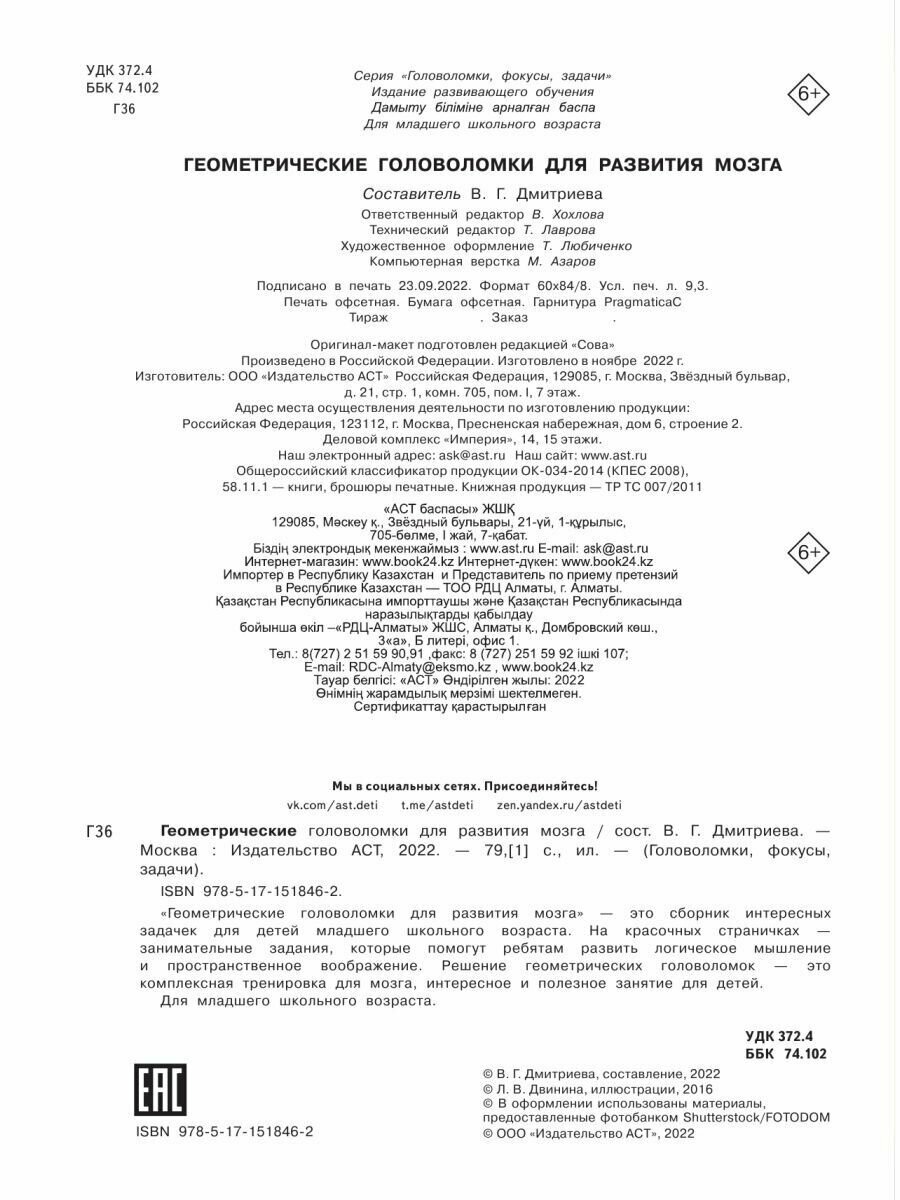 Сервис сравнения цен СкидкаГИД предлагает сравнить цены на товар «Книга: Геометрические головоломки для развития мозга (Дмитриева Валентина Геннадьевна (составитель)); Сова. Малыш (Обучающая и развивающая литература), 2022»