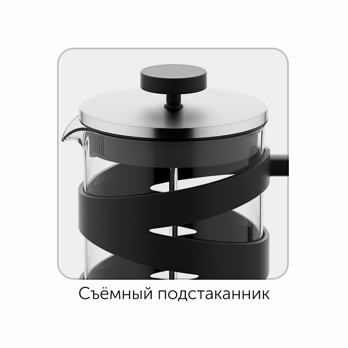Прочный подстаканник из нержавеющей стали с пластиковой подставкой обеспечивает дополнительную термоизоляцию и предохраняет колбу от повреждений. Удобная ручка с покрытием "Софт-тач" не нагревается и не выскальзывает из рук. Разборная конструкция изделий и системы фильтрации облегчают легкий и качественный уход. В комплекте предусмотрена мерная ложка 7г для точной дозировки продуктов