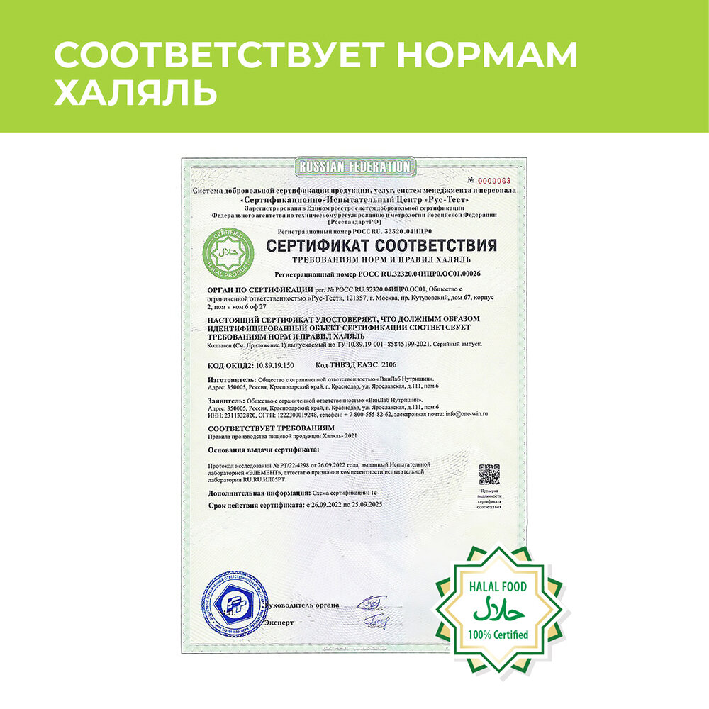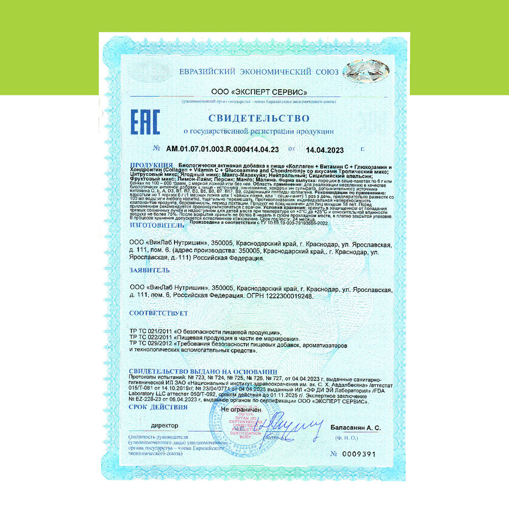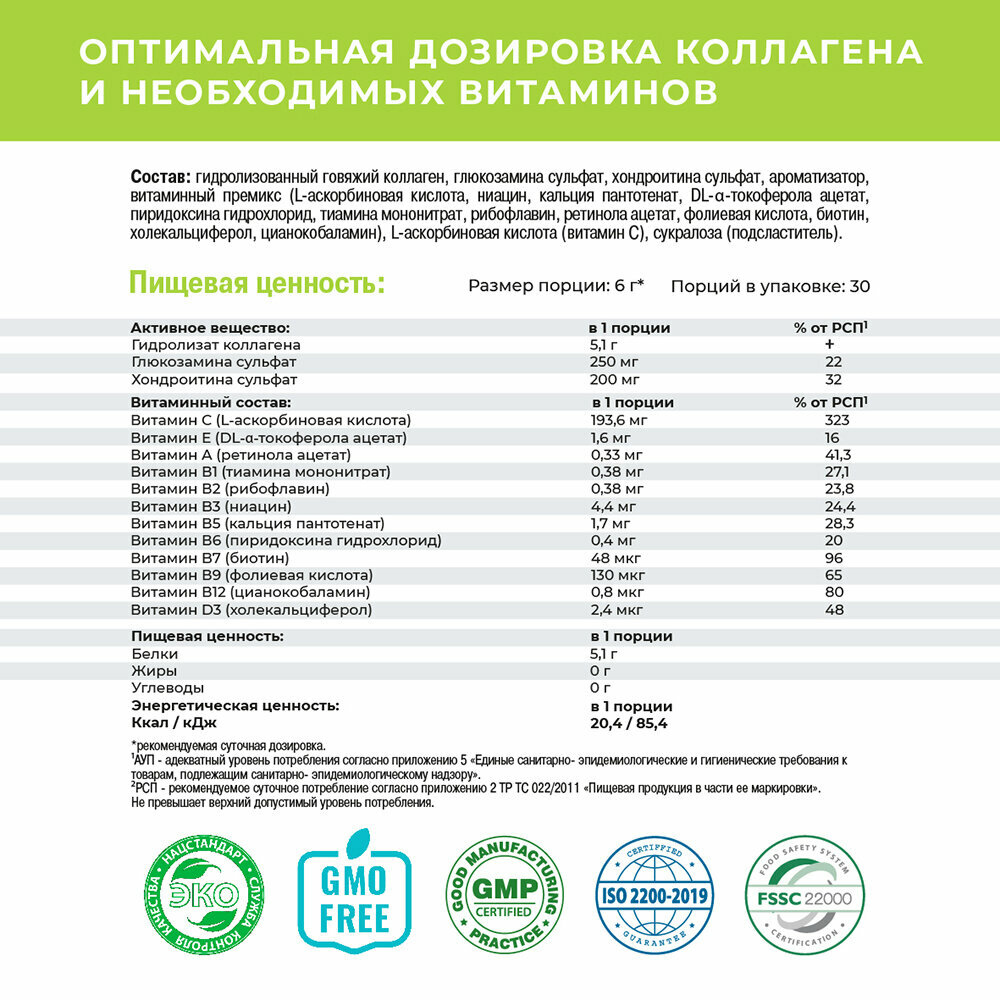 | Состав | Гидролизованный говяжий коллаген, аскорбиновая кислота, витаминный комплекс (биотин, аскорбиновая кислота, никотиновая кислота, токоферол, пантотеновая кислота, цианкобаломин, пиридоксин, тиамин, ретинол, рибофлавин, кальциферол), сукралоза, хондроитин, глюкозамин, ароматизатор |