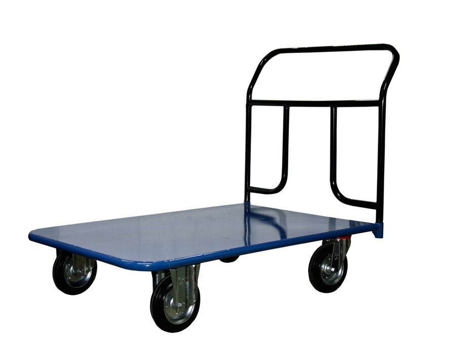 Платформенная 4-х колесная тележка КП-400-125-И используется для перемещения различных грузов в складских помещениях. Ручка крепится к платформе болтами, для компактного хранения можно снять, высота ручки 750мм. Платформа имеет уникальную рельефную, полимерную, противоскользящую поверхность, размером 700х1000мм. Цвет - синий, шагрень. Тележка комплектуется: метизами для крепления, двумя поворотными и двумя неповоротными промышленными колесами, диаметром 125мм., из черной стандартной резины, от всемирно известного, ведущего итальянского производителя Tellure Rota. Грузоподъемность до 390кг.