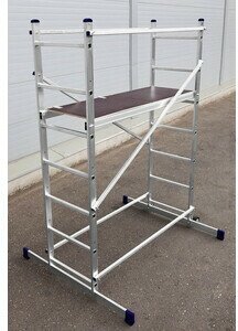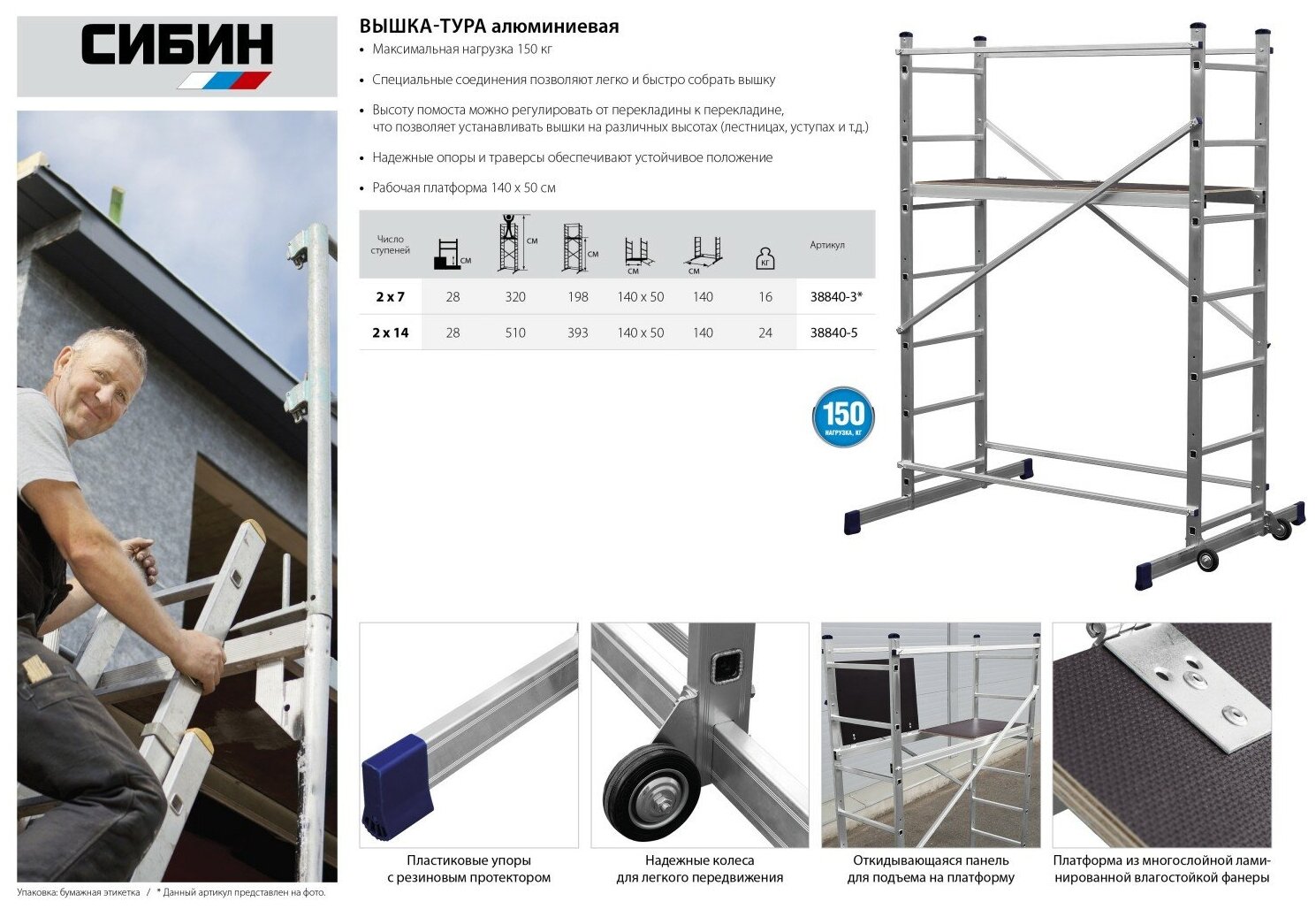 | Прочие особенности и свойства | Вышка-тура алюминиевая SIBIN со стабилизаторами – многофункциональная конструкция для внутренних и наружных ремонтно-отделочных и монтажных работ. Легкость и удобство эксплуатации достигается благодаря сочетанию надежной конструкции и высококачественных материалов. Специальные соединения позволяют легко и быстро собрать вышку Высоту помоста можно регулировать от перекладины к перекладине, что позволяет устанавливать вышку на различных высотах (лестницах, уступах и т.д.) Надежные опоры, траверсы и стабилизаторы шириной 120 см с пластиковыми заглушками обеспечивают устойчивое положение Противоскользящие опорные наконечники Высота:393 см Количество ступеней:2х14 Размер рабочей платформы |