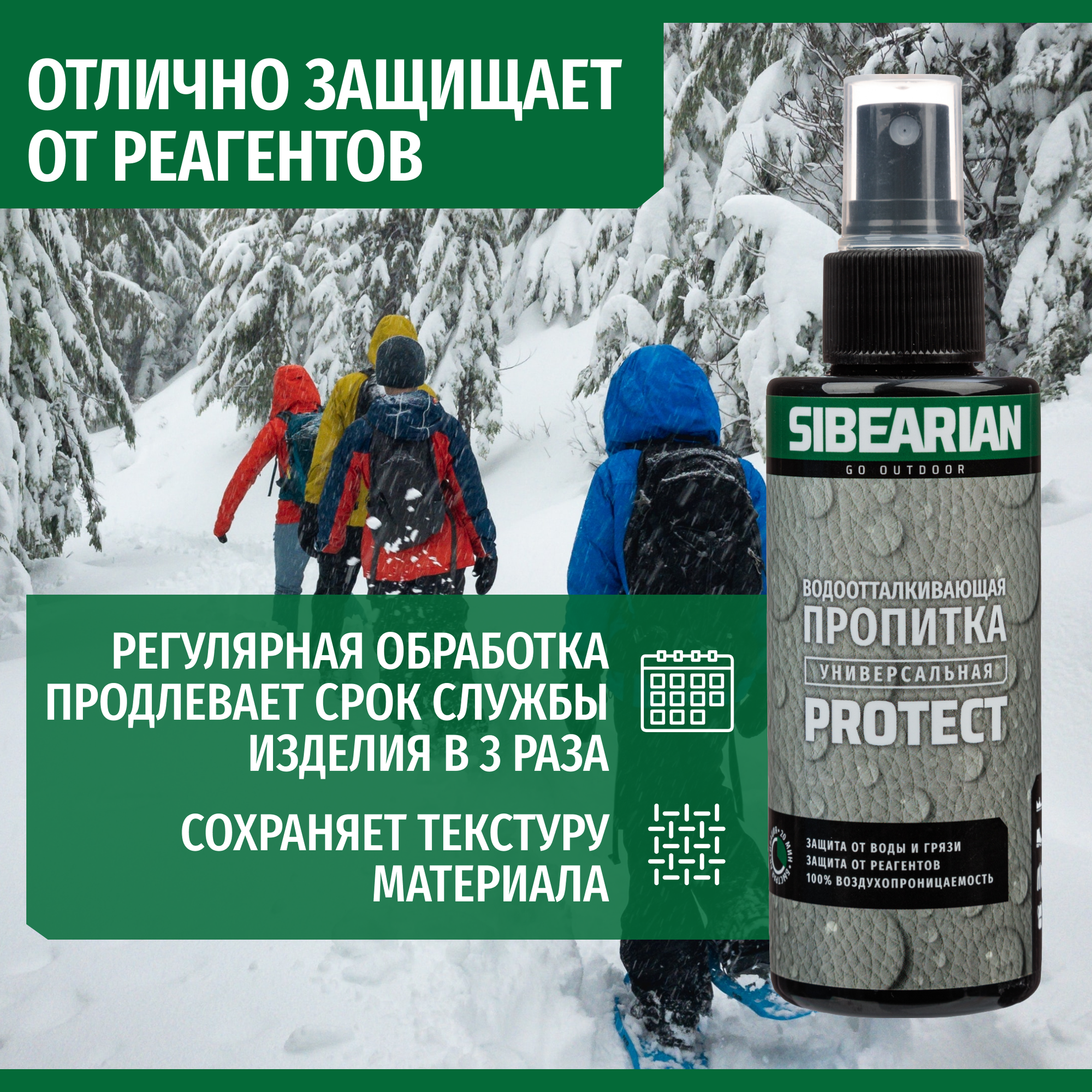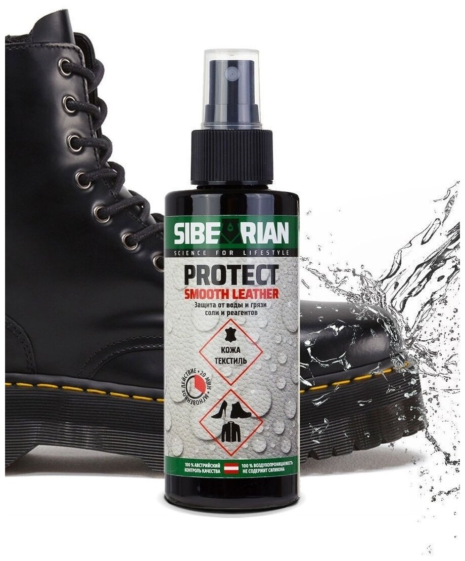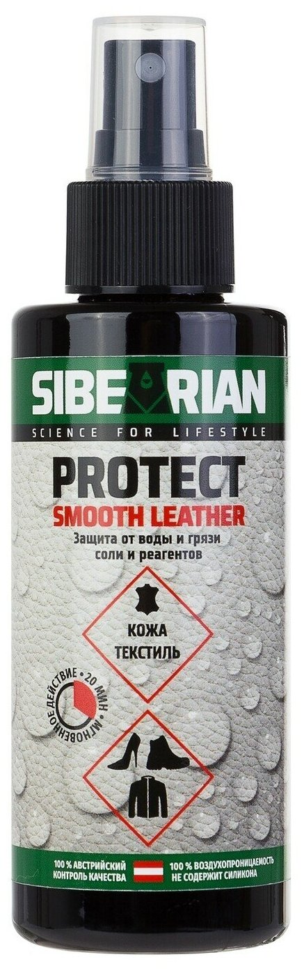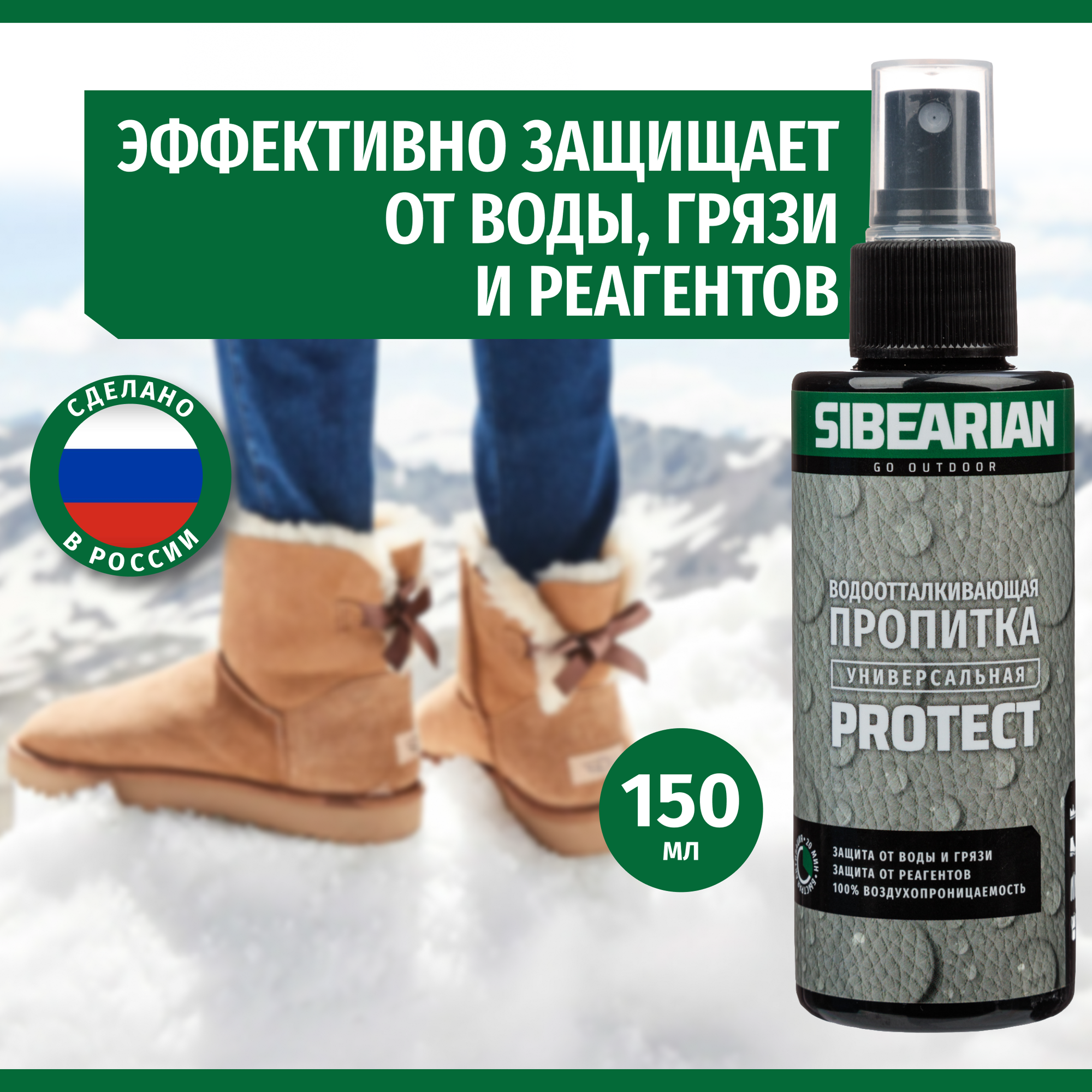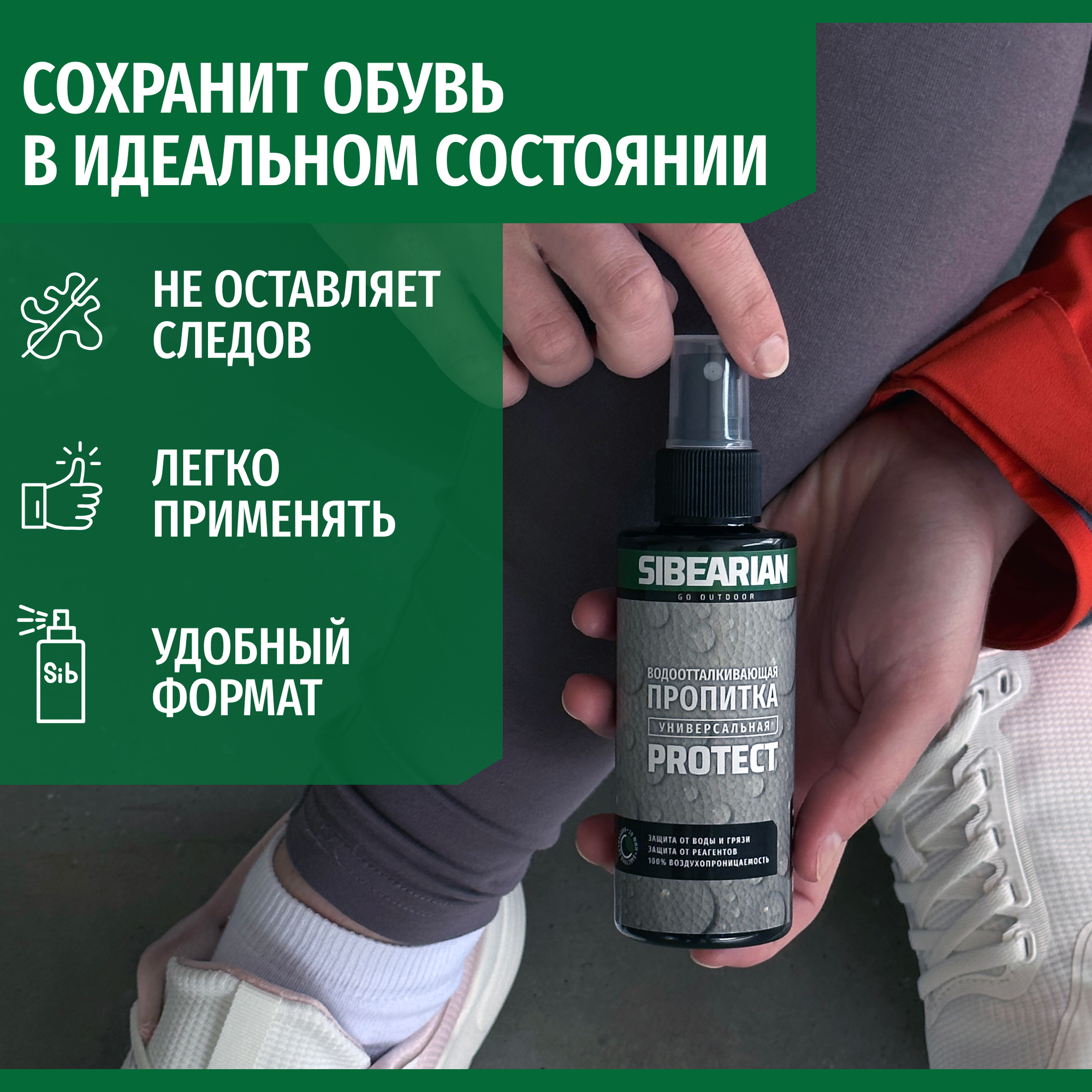 Универсальная водоотталкивающая пропитка SIBEARIAN PROTECT для защиты обуви и аксессуаров из кожи, замши, нубука, текстиля и их сочетаний от влаги, грязи, соли и реагентов. Универсальная пропитка для защиты обуви и аксессуаров из кожи, замши, нубука, текстиля и их сочетаний от влаги, грязи, соли и реагентов. Уникальная формула позволяет создать ультратонкое полимерное покрытие на отдельных волокнах кожи и текстиля, обеспечивая отличную водо- и грязеотталкивающую способность при сохранении воздухопроницаемости изделия. Не содержит силикон и не забивает поры кожи. Быстрая активация покрытия в течение 20 минут при комнатной температуре позволяет обрабатывать вещи непосредственно перед их использованием.