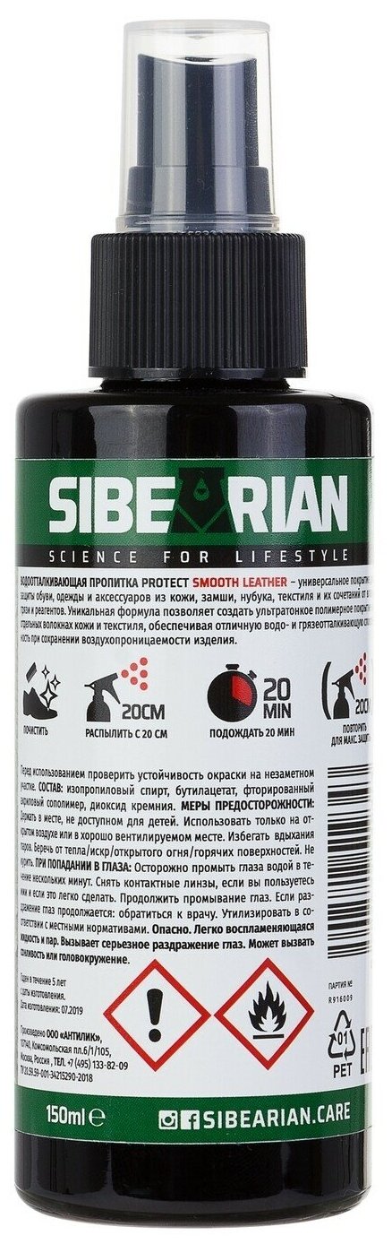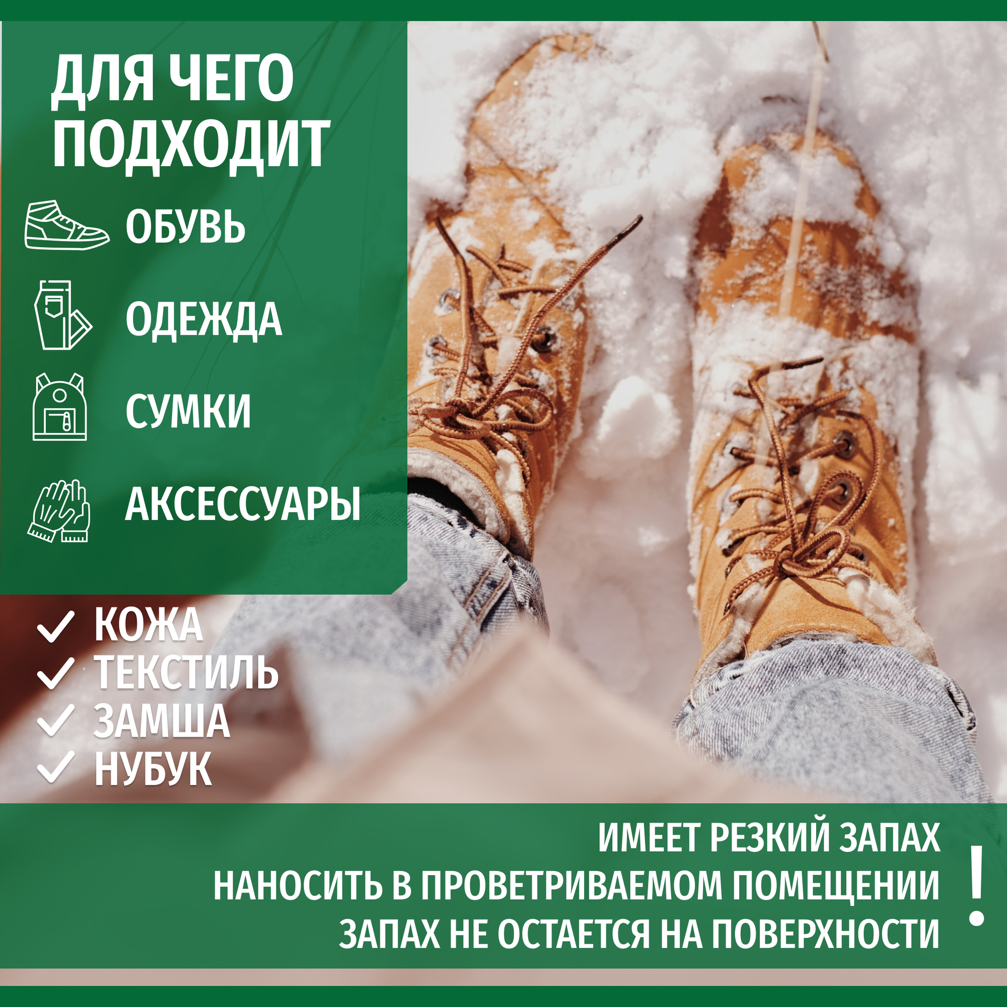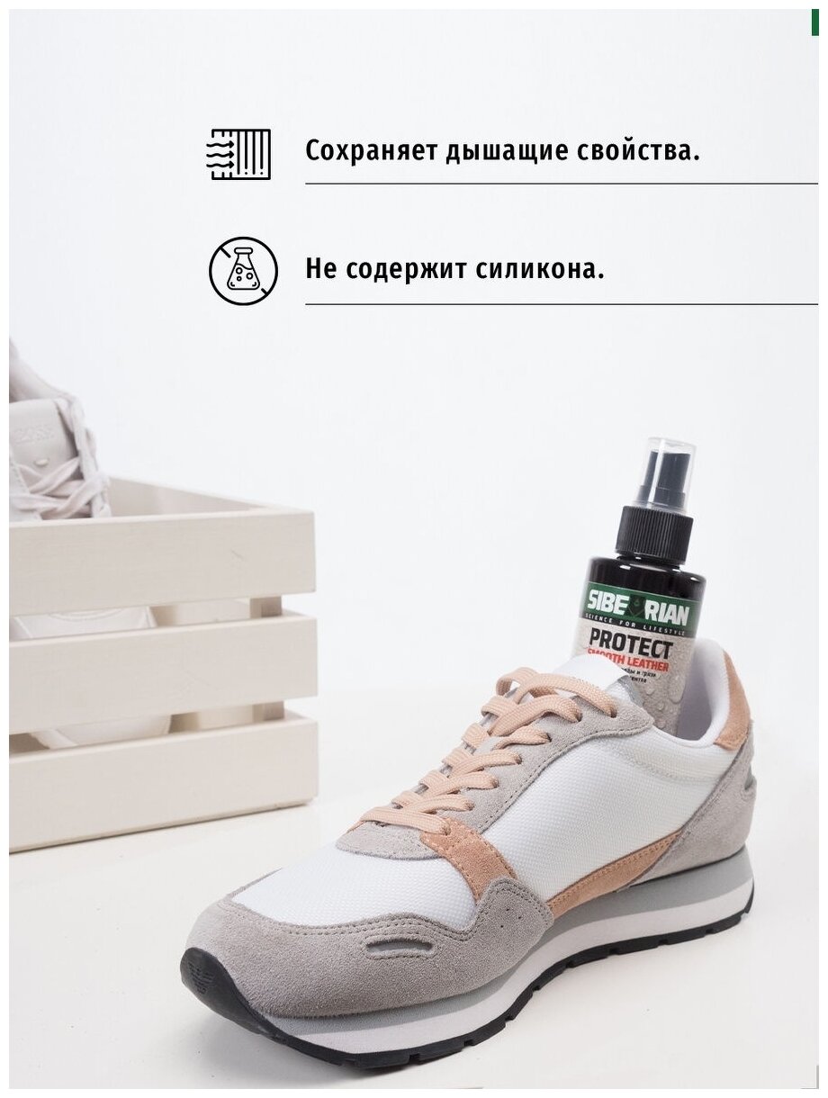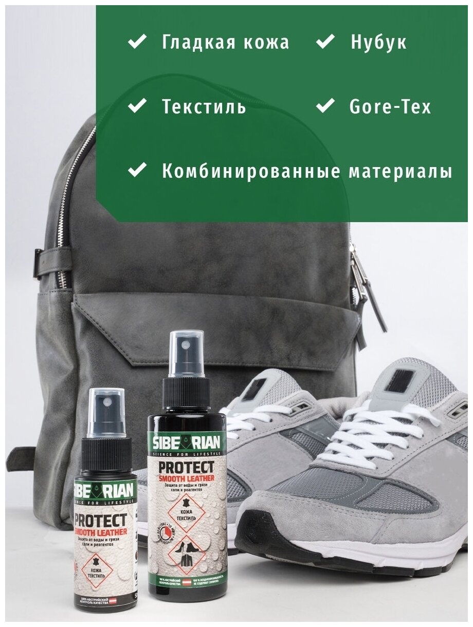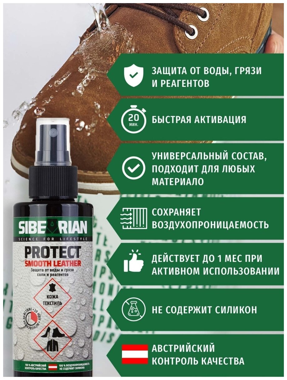 Универсальная водоотталкивающая пропитка SIBEARIAN PROTECT для защиты обуви и аксессуаров из кожи, замши, нубука, текстиля и их сочетаний от влаги, грязи, соли и реагентов. Универсальная пропитка для защиты обуви и аксессуаров из кожи, замши, нубука, текстиля и их сочетаний от влаги, грязи, соли и реагентов. Уникальная формула позволяет создать ультратонкое полимерное покрытие на отдельных волокнах кожи и текстиля, обеспечивая отличную водо- и грязеотталкивающую способность при сохранении воздухопроницаемости изделия. Не содержит силикон и не забивает поры кожи. Быстрая активация покрытия в течение 20 минут при комнатной температуре позволяет обрабатывать вещи непосредственно перед их использованием.