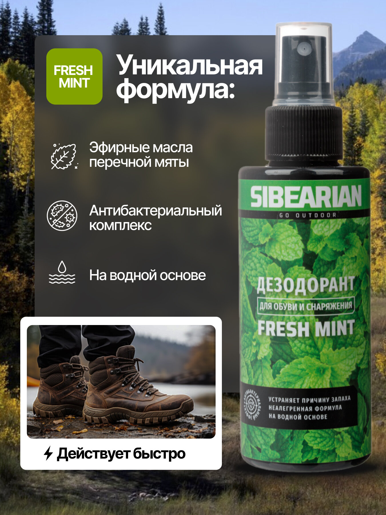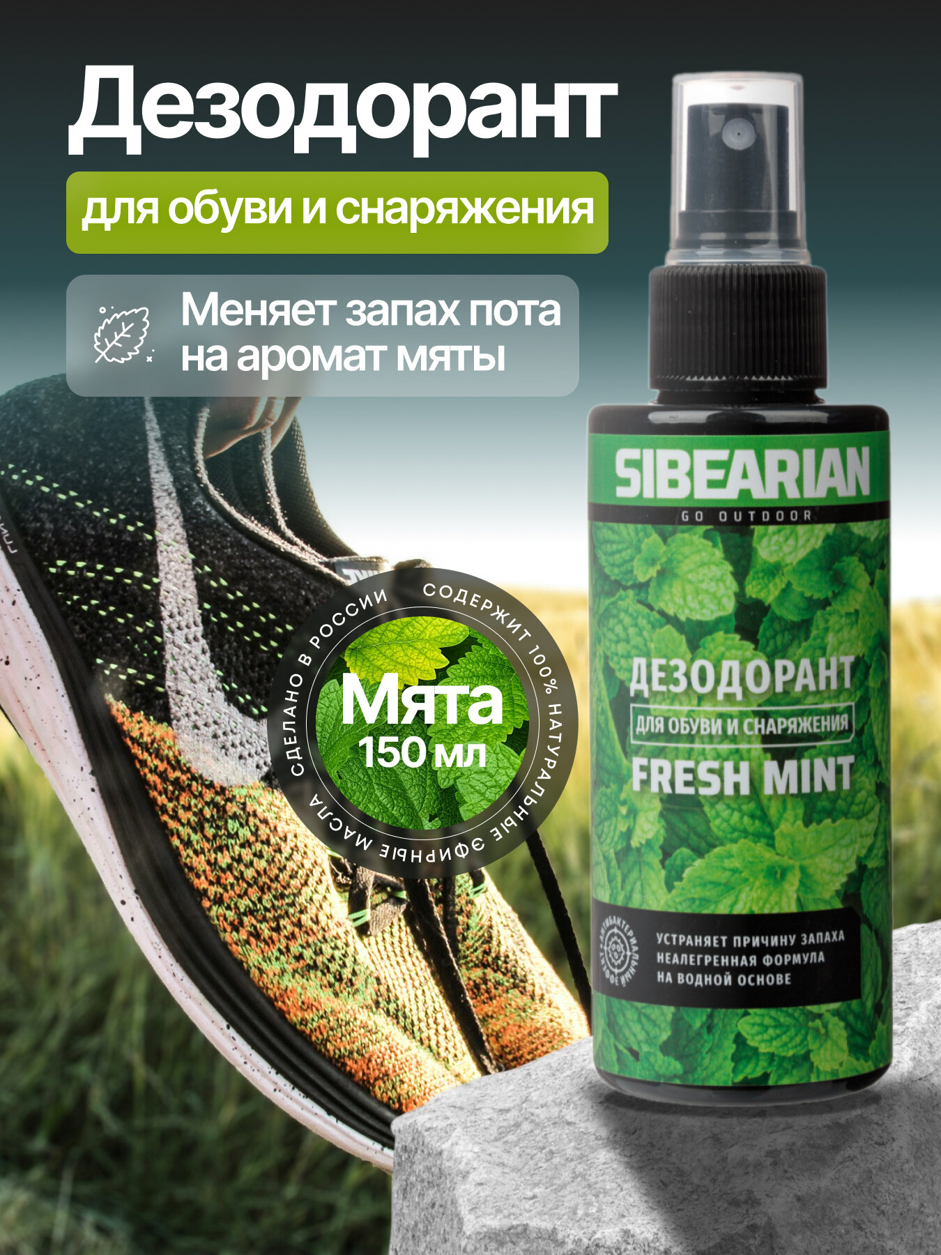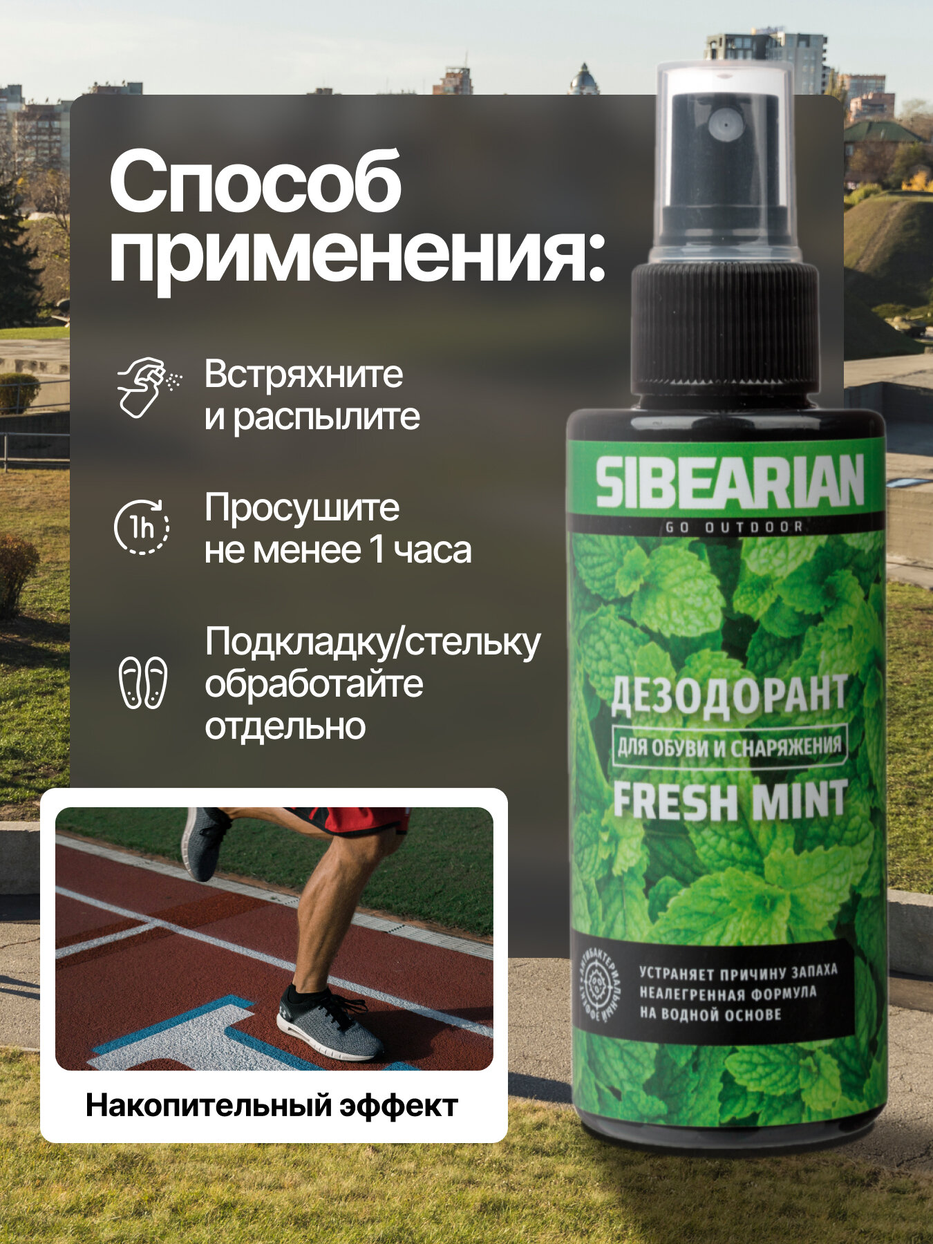 Антибактериальный дезодорант SIBEARIAN FRESH MINT для обуви и спортивного снаряжения с натуральным ароматом свежей мяты. Избавит спортивное снаряжение, одежду и обувь от неприятного запаха. Отлично подойдет для обработки шлемов, перчаток, горнолыжных и сноубордических ботинок, экипировки для единоборств, хоккея, авто-, мото-, вело- и других видов спорта. Благодаря наличию в составе антибактериального компонента и наночастиц серебра устраняет микроорганизмы, являющиеся причиной возникновения неприятного запаха. Легкий аромат зеленой мяты придаст свежесть обработанным вещам.