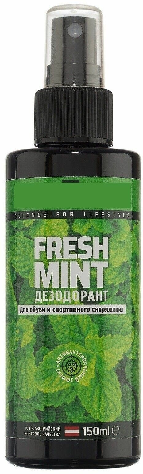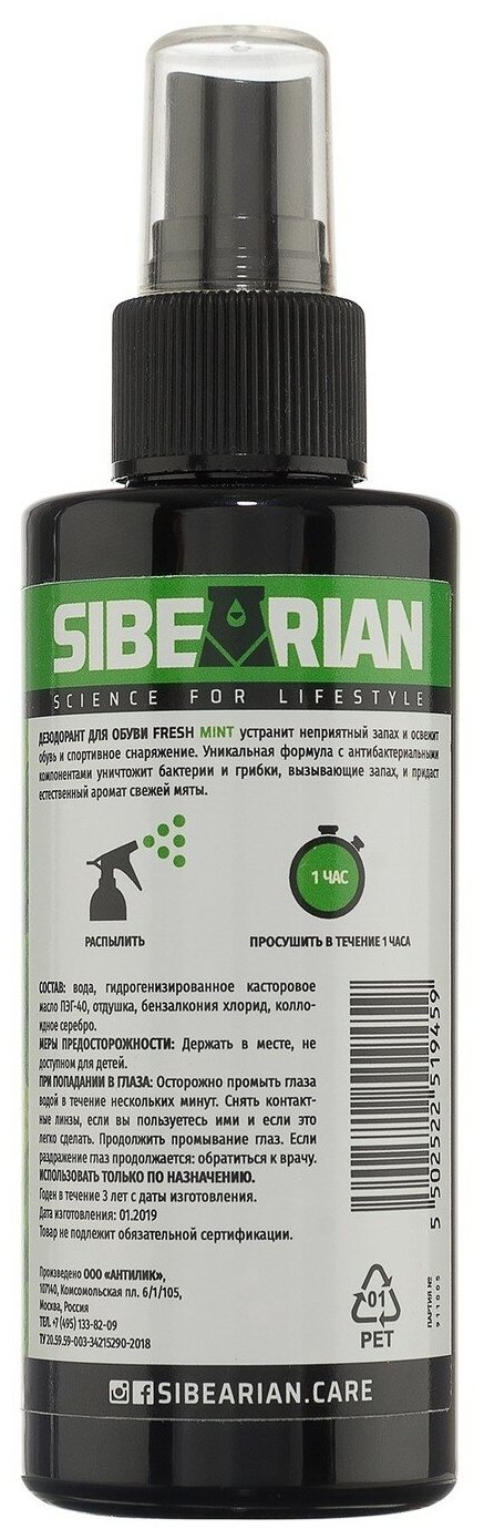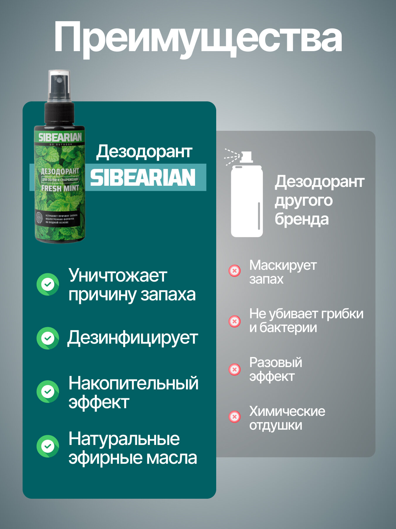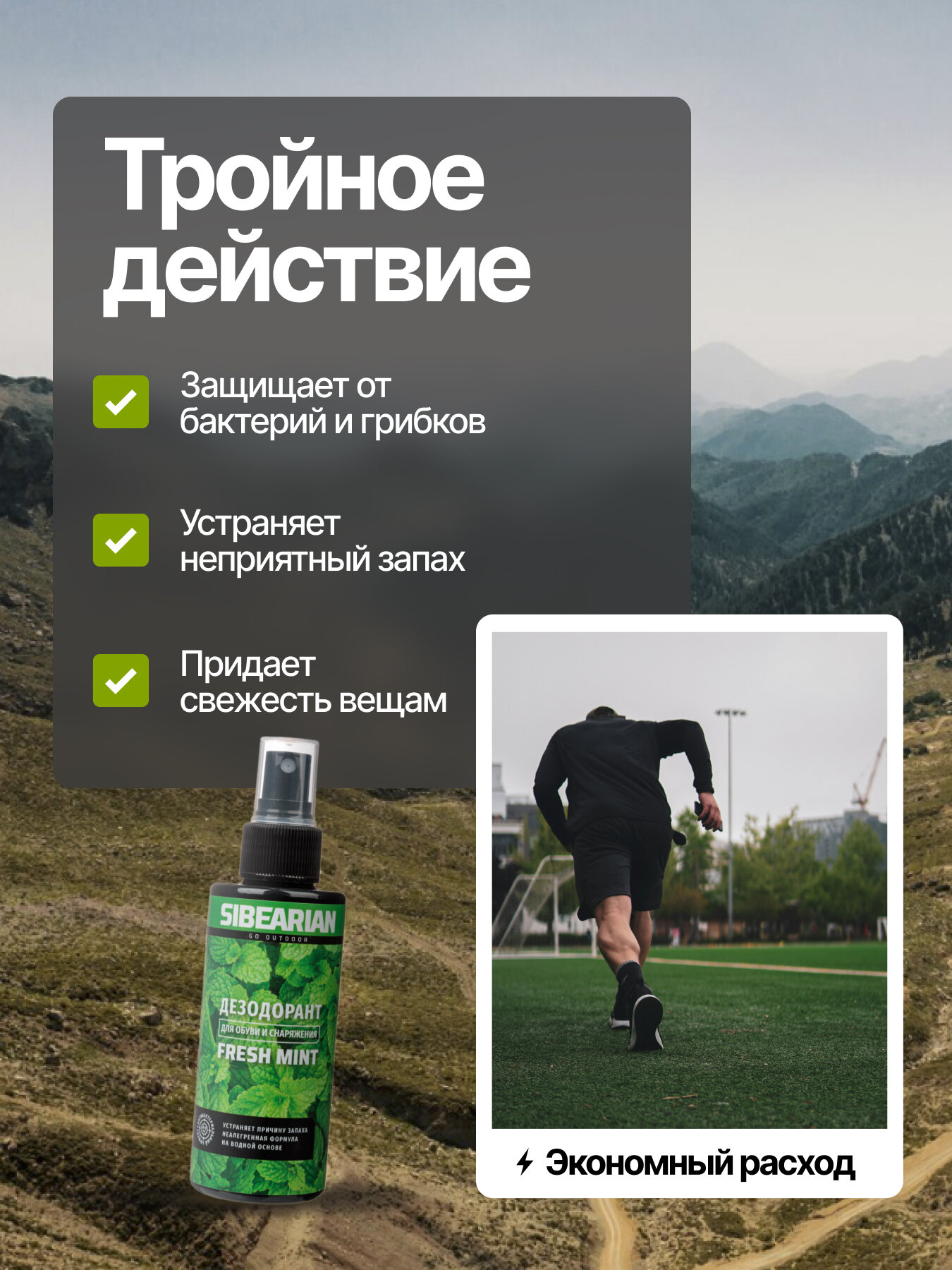 Антибактериальный дезодорант SIBEARIAN FRESH MINT для обуви и спортивного снаряжения с натуральным ароматом свежей мяты. Избавит спортивное снаряжение, одежду и обувь от неприятного запаха. Отлично подойдет для обработки шлемов, перчаток, горнолыжных и сноубордических ботинок, экипировки для единоборств, хоккея, авто-, мото-, вело- и других видов спорта. Благодаря наличию в составе антибактериального компонента и наночастиц серебра устраняет микроорганизмы, являющиеся причиной возникновения неприятного запаха. Легкий аромат зеленой мяты придаст свежесть обработанным вещам.