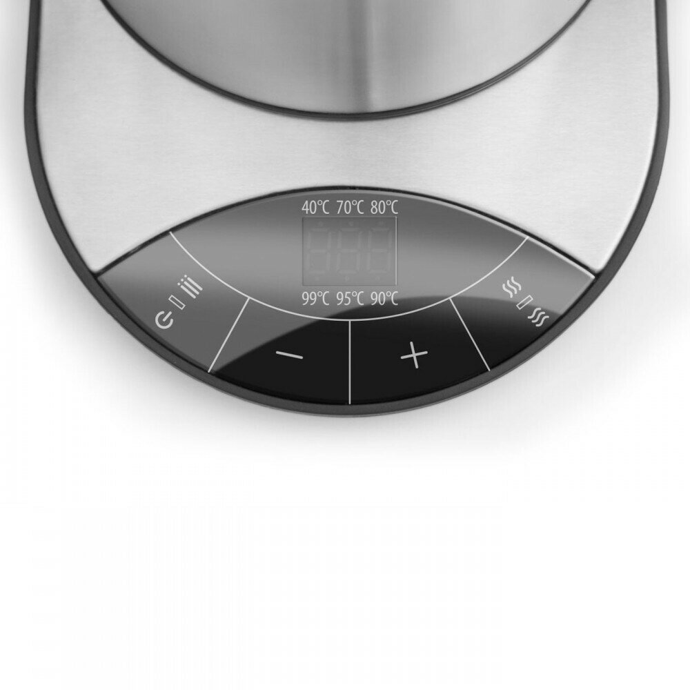 | Прочие особенности и свойства | Высокоточный контроль температуры нагрева от 40 °C до 100 °С (6 предустановок),Звуковой сигнал при достижении заранее выбранной температуры,Поддержание установленного уровня температуры,Сенсорное управление, дисплей с указанием текущей температуры,Безопасная крышка открывается нажатием кнопки,Скрытый нагревательный элемент из нержавеющей стали,Автоматическое отключение при снятии с подставки,Защита от перегрева (включения без воды) |