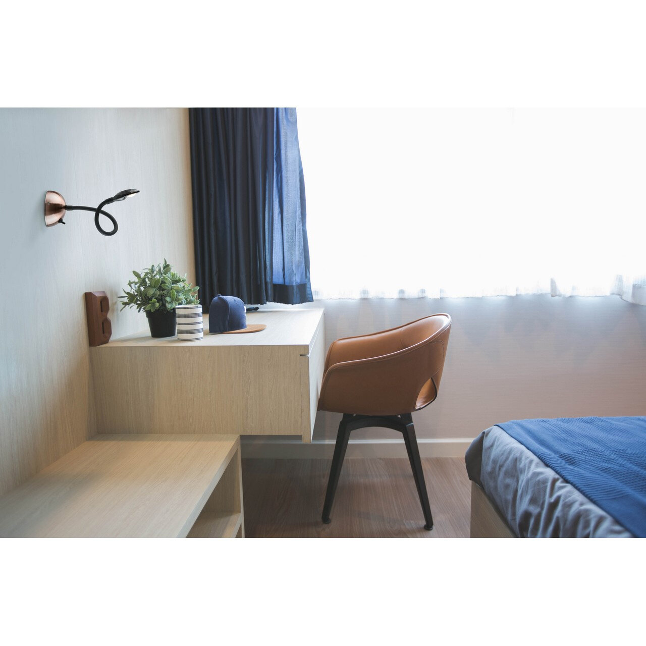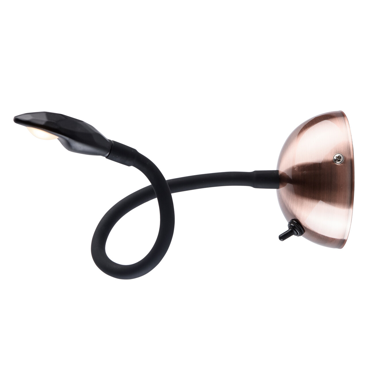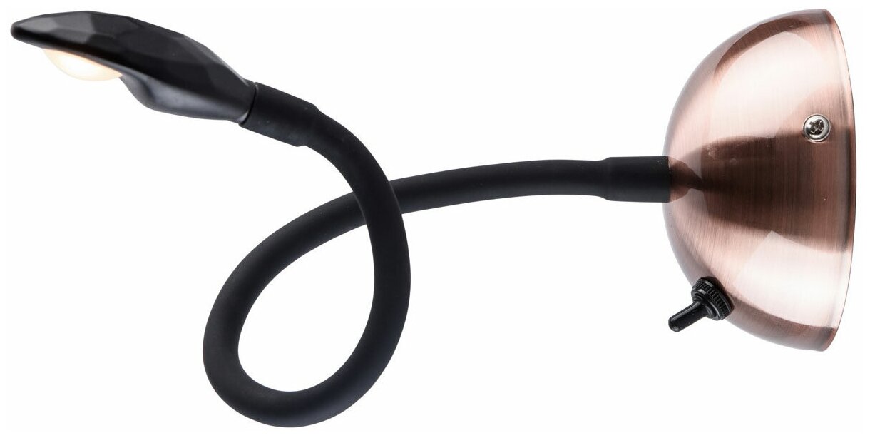 Основание светильника выполнено из металла и гальванизировано в цвет меди. Потолочная чаша: обработка на токарном станке.Гибкий рожок: силикон черного цвета. Светодиодный источник света типа СOB.