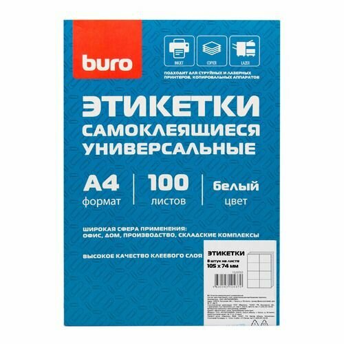 Этикетки Buro формат A4, 100 листов, односторонняя, покрытие матовое, с самоклеющимся слоем, универсальная, белый