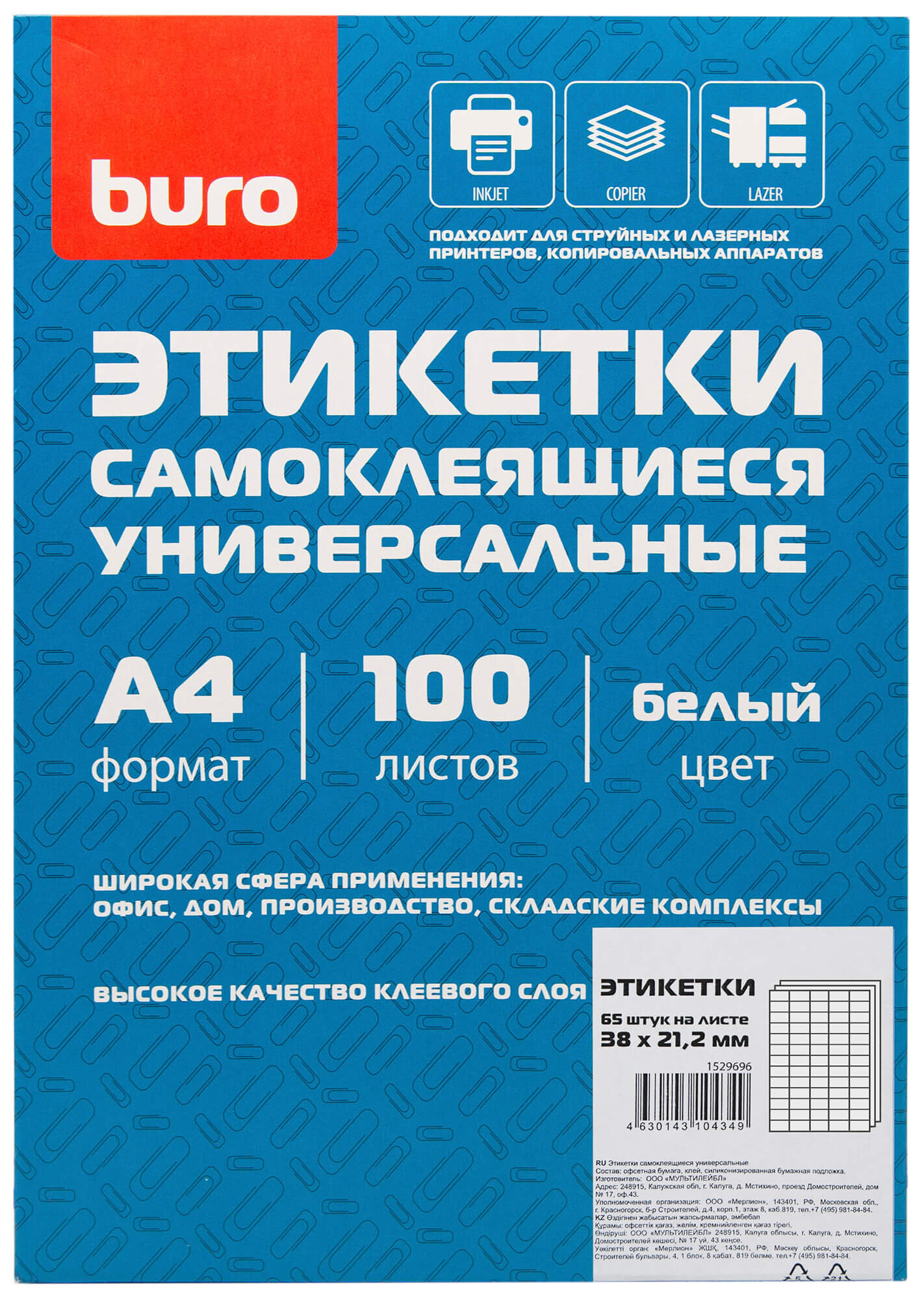 Этикетки Buro формат A4, 100 листов, покрытие матовое, с самоклеющимся слоем, универсальная, белый