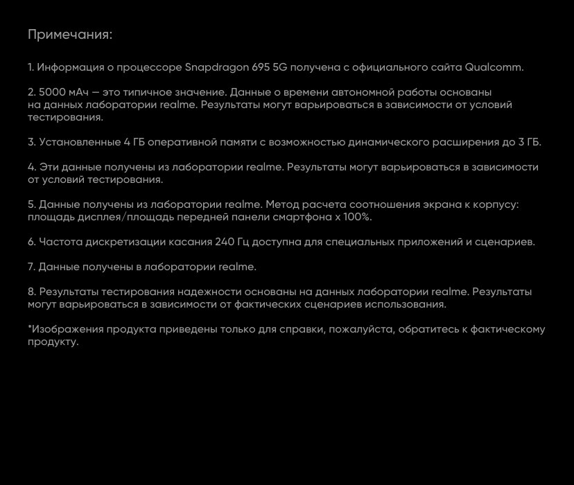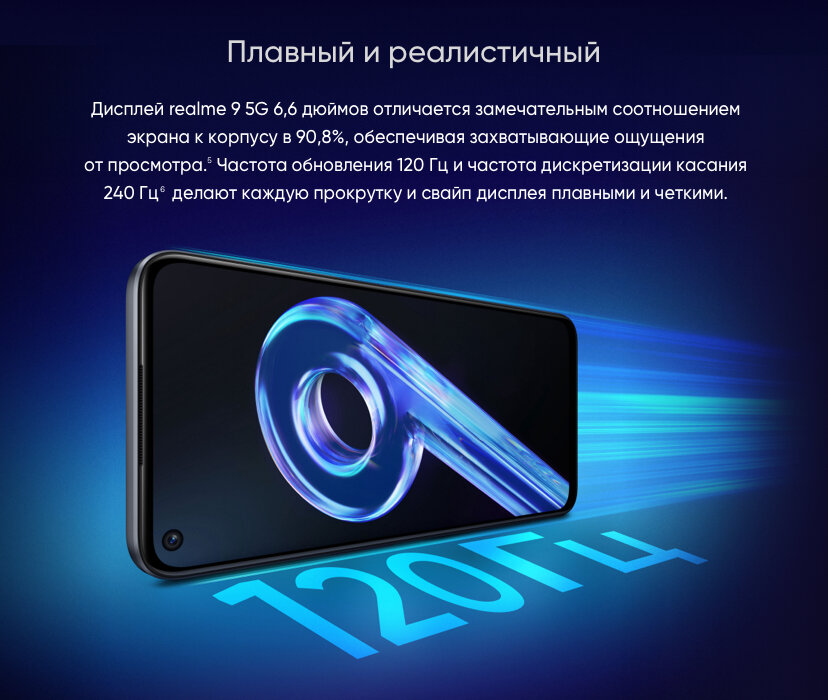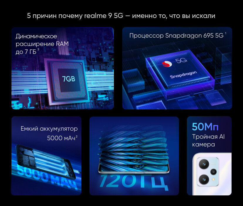 Realme 9 5G работает на базе процессора Snapdragon 695 5G, обеспечивающего плавную работу. Процессор построен по усовершенствованному 6–нм техпроцессу, его частота достигает 2,2 ГГц, что на 15% быстрее, чем у смартфонов предыдущего поколения. Наличие этого процессора гарантирует как более быструю работу приложений, так и более высокую энергоэффективность.