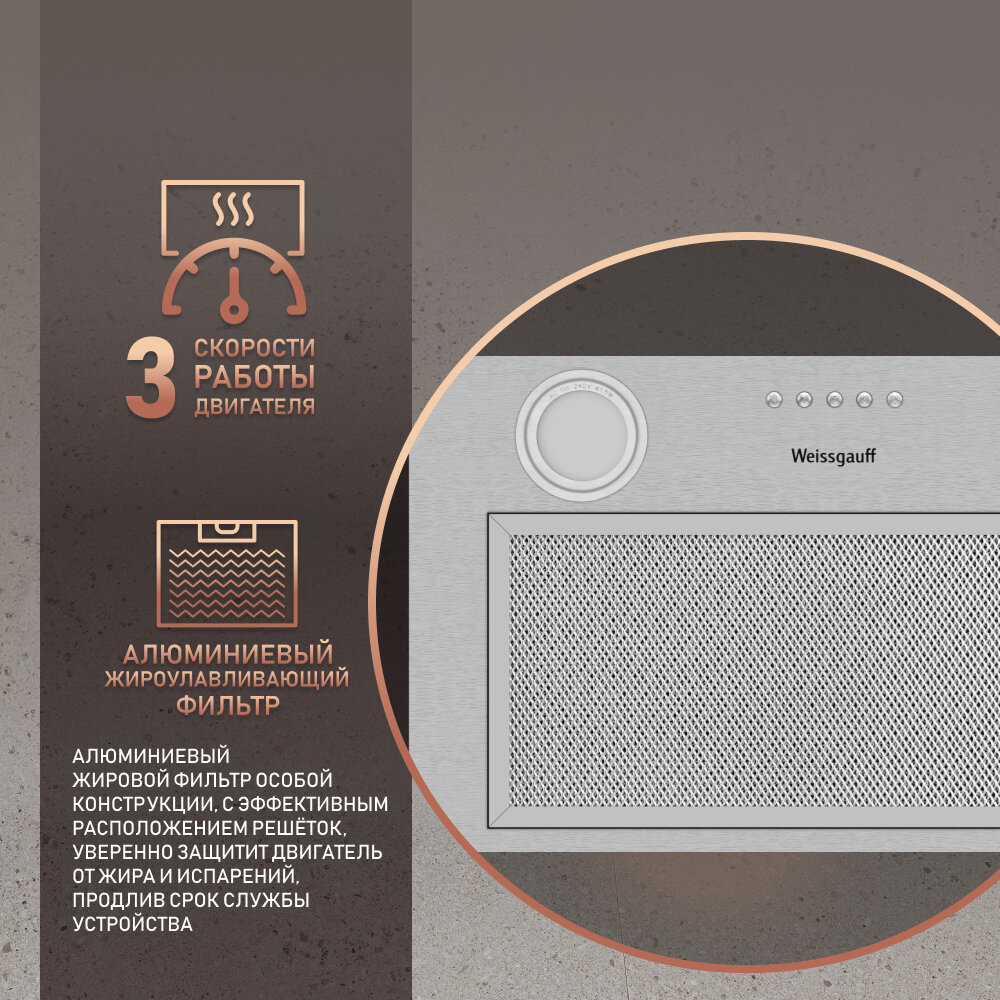 Встраиваемая вытяжка Weissgauff Box 455 Inox нержавеющая сталь, количество двигателей: 1, режим работы: отвод/циркуляция, кнопочное управление, алюминиевый жироулавливающий фильтр (430309)