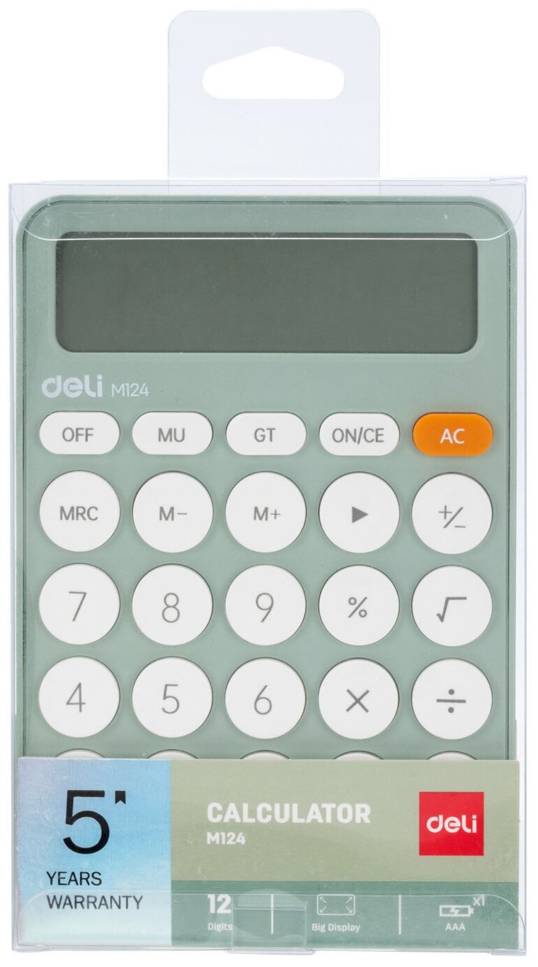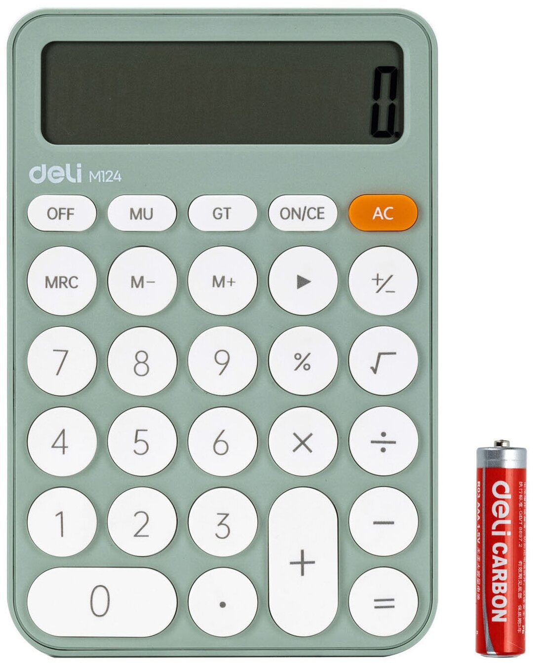 Калькулятор настольный Deli EM124GREEN зеленый, дисплей: 12-разрядный, однострочный, монохромный, питание батарея AAA х 1шт.