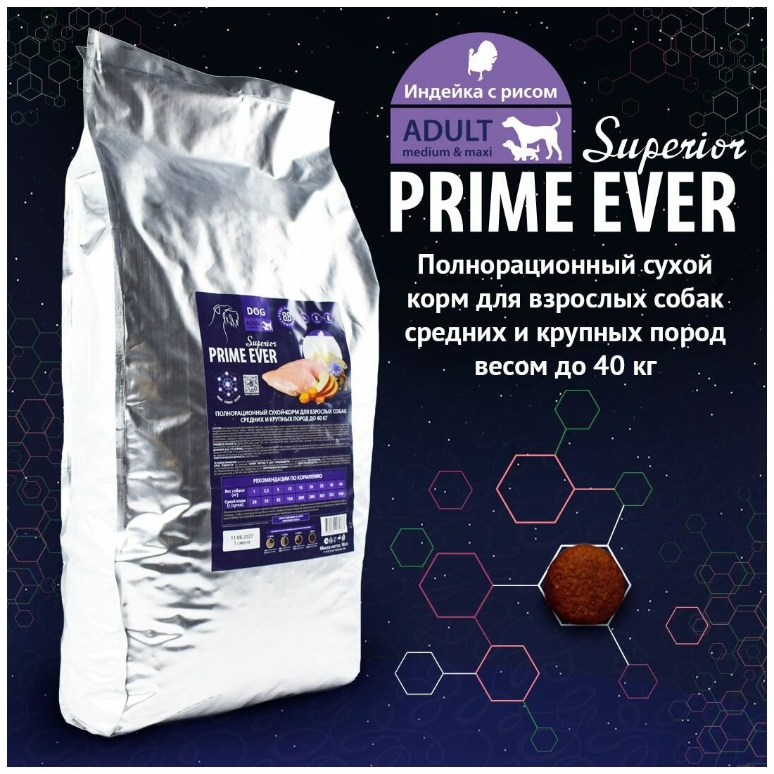 Полнорационный сухой корм для взрослых собак средних и крупных размеров весом до 40 кг. Корм PRIME EVER Superior является супер-премиальным и полнорационным. Все корма данной линейки содержат Prime Synergy System - систему синергии натуральных компонентов, которая позволяет питомцу усвоить весь комплекс питательных веществ. Основная часть ингредиентов выращивается в чистейшем и красивейшем крае – на Алтае. Щадящая технология производства способствует максимальной сохранности питательных веществ и витаминов, корм лучше усваивается и заметно улучшается состояние кожи и шерсти питомца, а также всего здоровья в комплексе. Размер гранулы 14-15 мм.