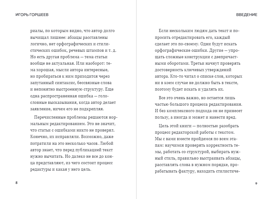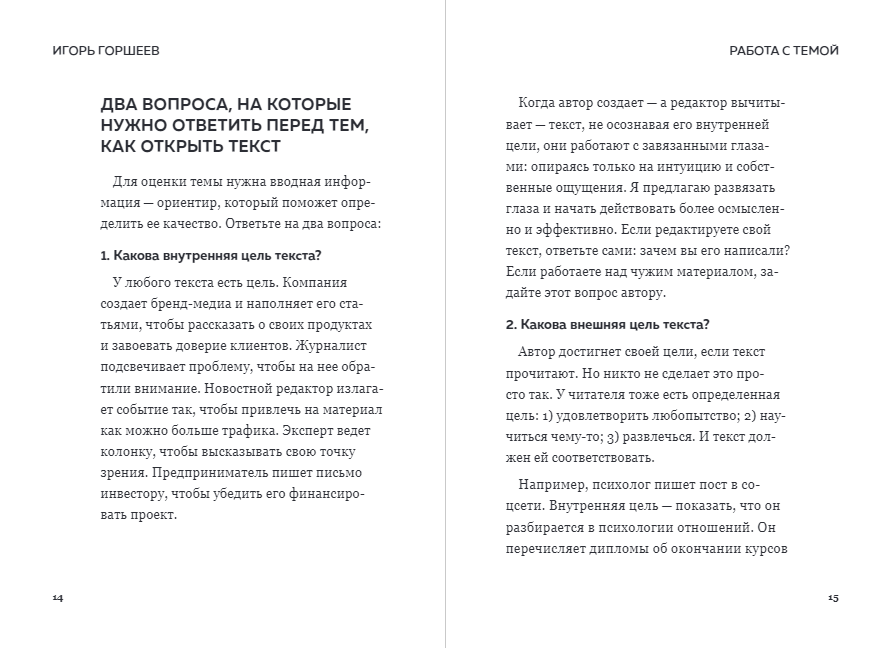 В своей работе Игорь Горшеев говорит об основах редактуры. Все коротко и по делу. Так, в хорошей теме желания автора не противоречат ценностям читателя. При изложении мысли нужно понимать, где описание, где повествование, а где рассуждение. Текст должен быть достоверным, аргументированным, логичным, подкрепленным фактами. Важно понимать, где категорические суждения, а где гипотетические. Для каждого случая предусмотрена своя подача материала. В книге грамотно объяснены правила выстраивания предложений. Игорь Горшеев коротко и понятно учит обращать внимание на моменты, без которых невозможно написать хороший текст.