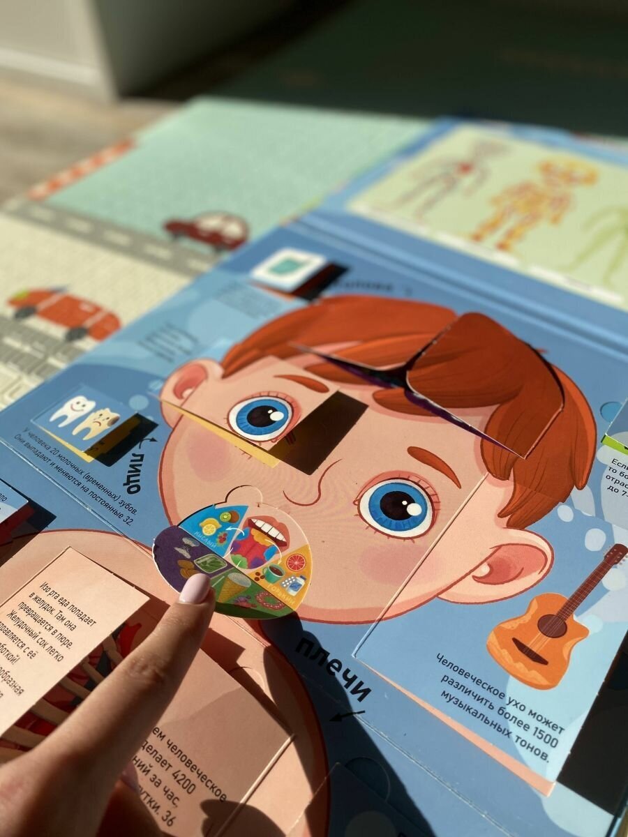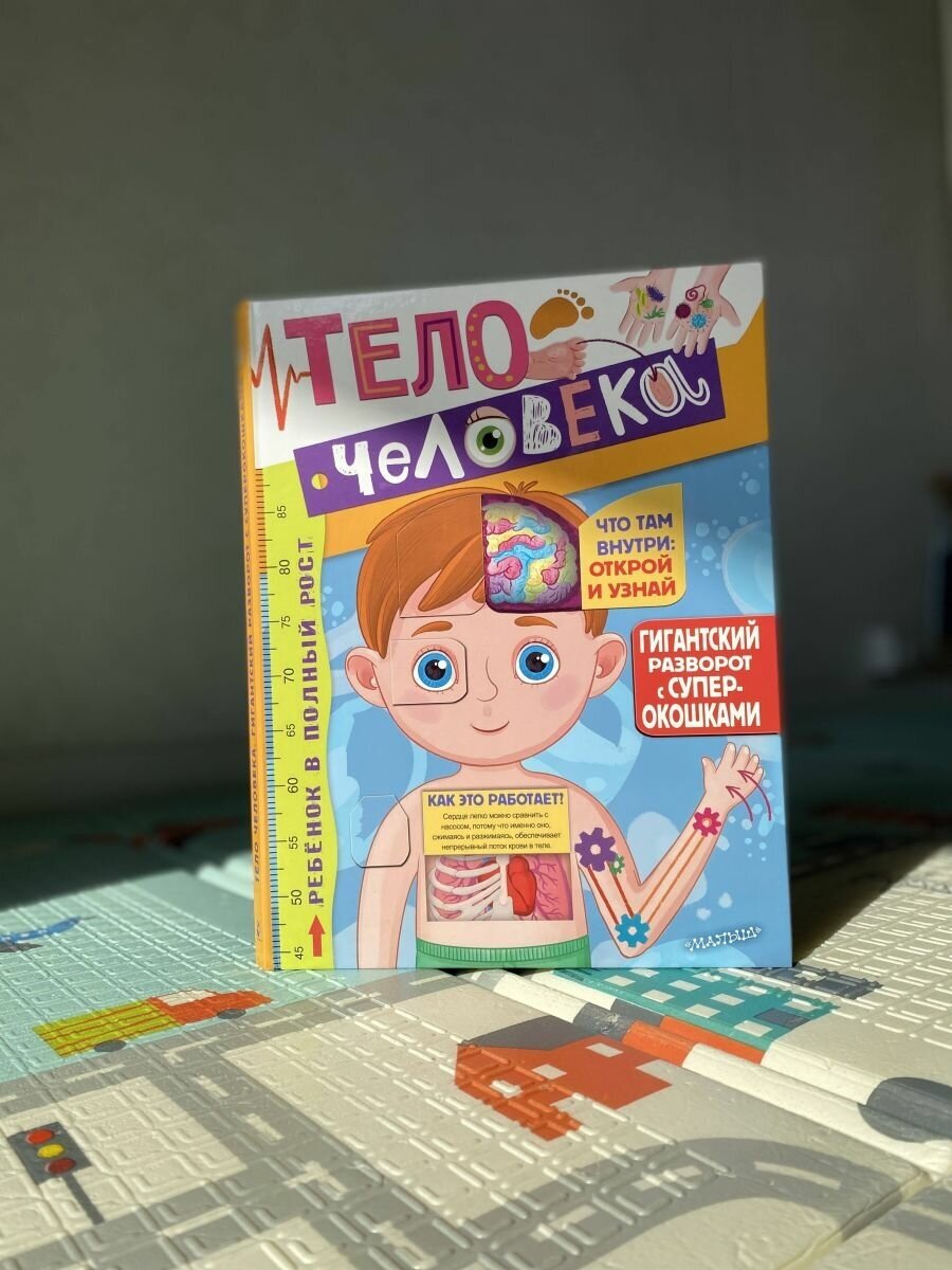 При выборе познавательной книги для ребенка, мой выбор пал на энциклопедию \"Тело человека\". В первую очередь, мне понравилось то, что книга необычного формата с окошками. Несмотря на небольшое количество страниц, книга раскладывается в большой размер, что вызвало восторг у ребёнка и сделало изучение книги ещё более интересным. Окошки книги удобно открывать даже ребёнку. Также меня порадовали яркие иллюстрации в энциклопедии.