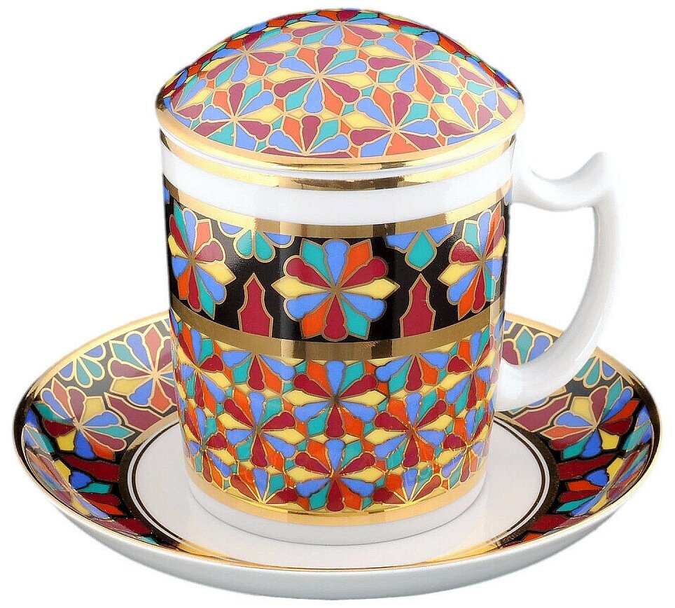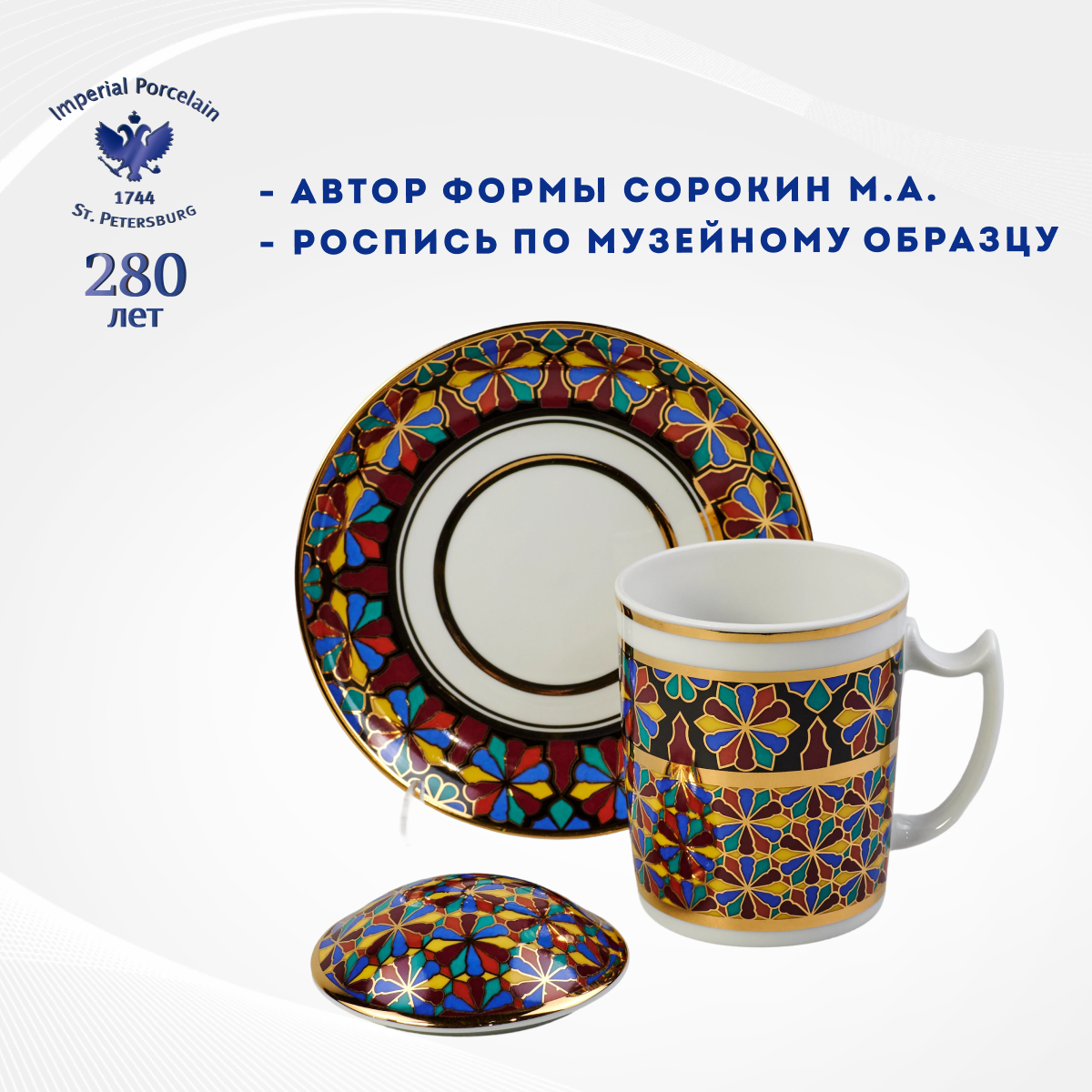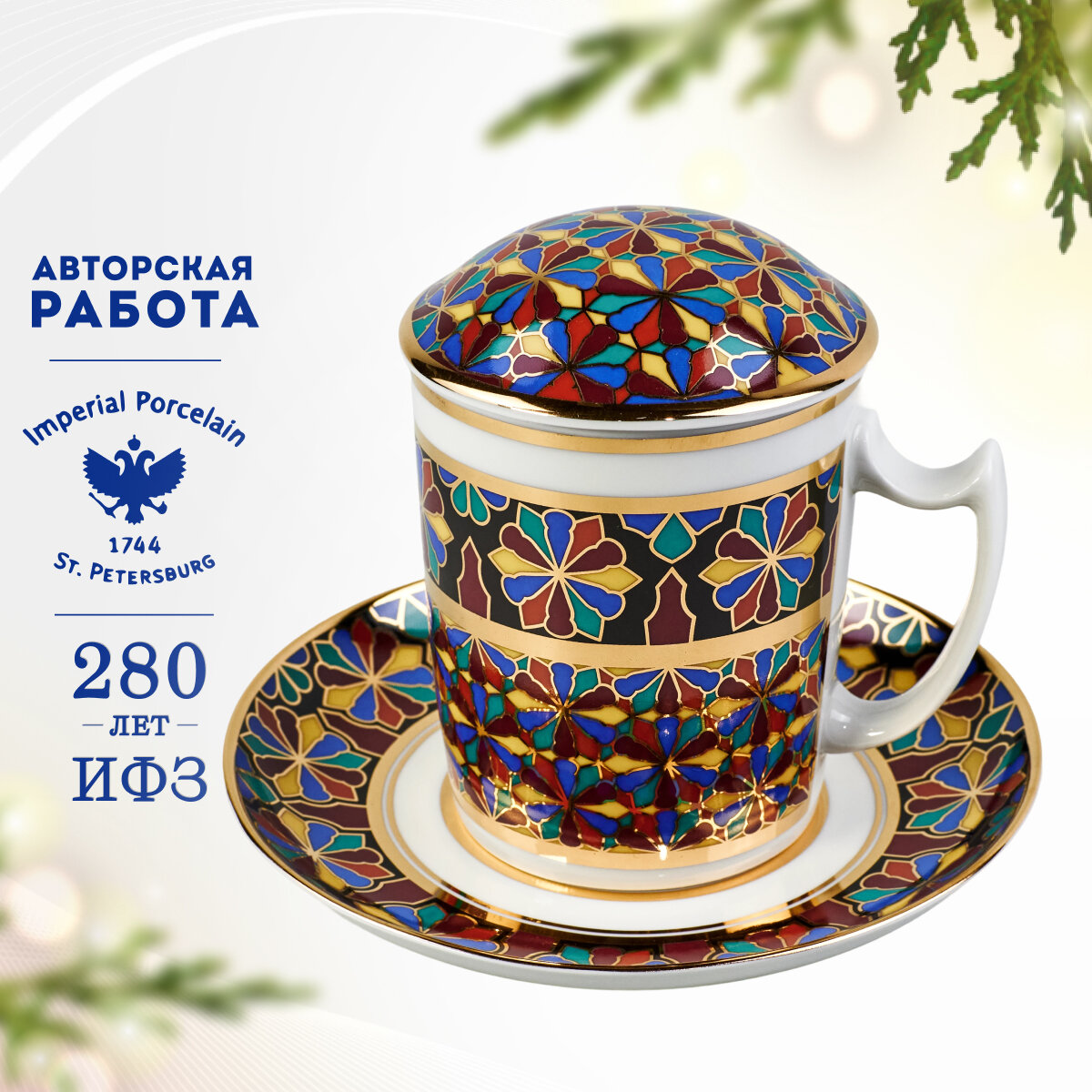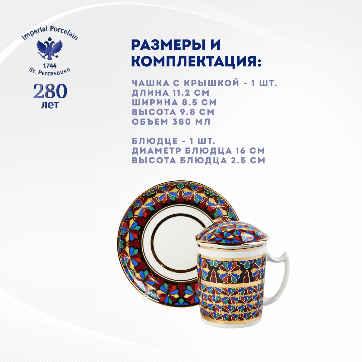 Выпускается с 1998 года.Твердый фарфор, надглазурная деколь, отводка золотом.Автор рисунка - Серафима Богданова, автор формы - Михаил Сорокин.Объем бокала - 380 мл, высота - 9.8 см. Рекомендуем мыть вручную. Обратите внимание! Объем указан до краев, полезный объем может быть меньше на 10-50 мл в зависимости от формы изделия. Диаметр блюдца - 16 см.