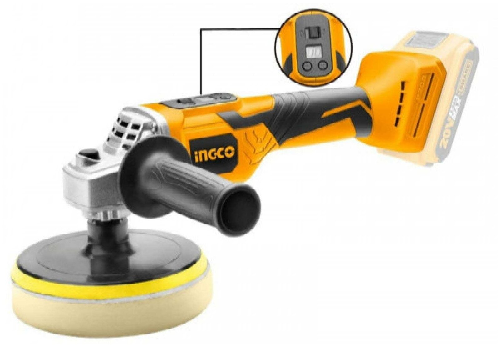 Аккумуляторная угловая полировальная машина 20 В INGCO INDUSTRIAL оборудована бесщеточным мотором и LCD дисплеем для отображения скорости вращения. Инструмент предназначен для финишной обработки поверхностей. Есть возможность выбора скорости вращения диска в зависимости от типа обрабатываемой поверхности.