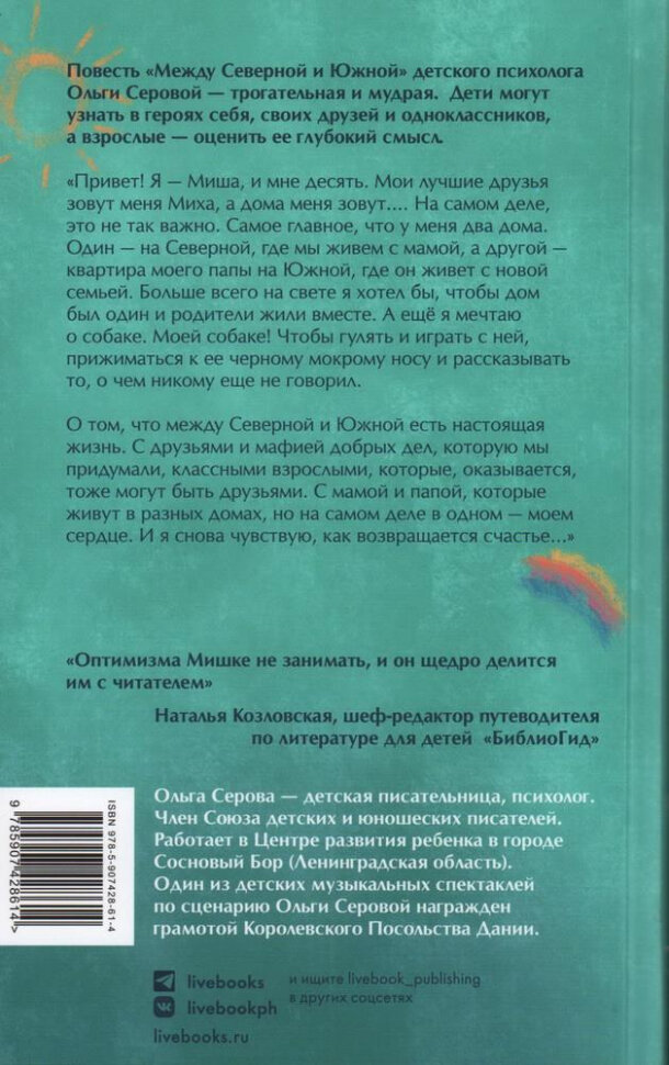 Повесть "Между Северной и Южной" детского психолога Ольги Серовой - трогательная и мудрая. Дети могут узнать в героях себя, своих друзей и одноклассников, а взрослые - оценить ее глубокий смысл.