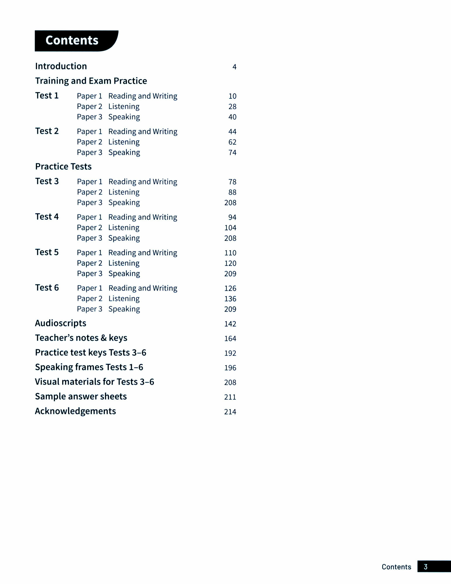 Tests 1 & 2 contain information about the exam as well as step-by-step guidance, exercises and tips. Tests 3 - 6 are straight practice tests without guidance.