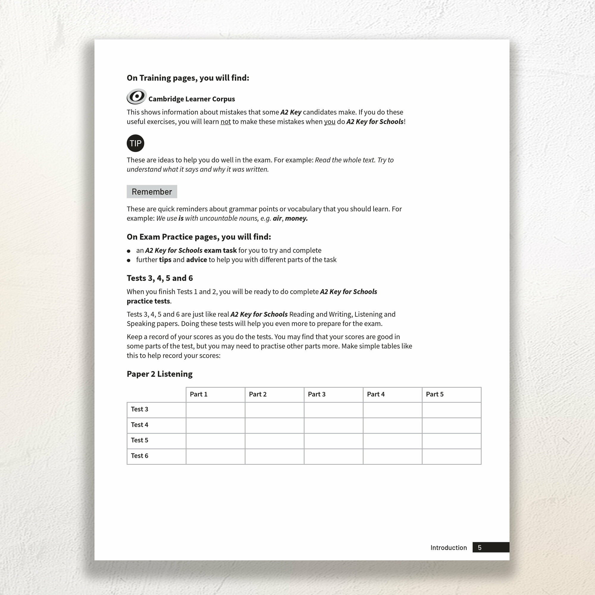 The 'with answers' edition can be used to practice the exam at home or in class, providing an excellent opportunity for teachers and students to familiarise themselves with the A2 Key for Schools examination format. The six practice tests feature explanatory keys and model answers, and include ideas for extending tasks in class. The first two tests also include step-by-step advice on how to tackle each paper. Extra practice activities, informed by a bank of real Key for Schools candidates' exam papers, focus on areas where students typically need most help. Downloadable audio includes the recordings for the listening tests.