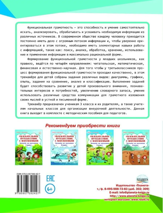 Буряк М. В, Шейкина С. А. Функциональная грамотность 3 класс. Тренажер для школьниковФункциональная грамотность – это способность и умение самостоятельно искать, анализировать, обрабатывать и усваивать необходимую информацию из различных источников. В современном обществе каждому человеку приходится постоянно иметь дело с огромным потоком информации и, чтобы уверенно ориентироваться в этом потоке, необходимо иметь элементарные навыки работы с информацией, такие как: поиск, анализ, обработка, хранение, использование и применение информации в максимально рациональной форме.Формирование функциональной грамотности у младших школьников, как правило, ведётся по четырём направлениям: читательская, математическая, финансовая и естественно-научная. Для того чтобы у третьеклассников процесс формирования функциональной грамотности проходил качественно, в этом тренажёре для детей собраны задания различных видов: диаграммы, графики, опыты, задания на сравнение, анализ и классификацию. Выполнение заданий будет способствовать развитию у детей произвольного внимания, познавательных интересов и потребностей, увеличению словарного запаса, умению использовать различные средства коммуникации для грамотного изложения своих мыслей в устной и письменной форме.Тренажёр предназначен ученикам 3 класса и их родителям, а также учителям начальных классов для организации внеурочной деятельности. Данная книга выходит в комплекте с методическим пособием для педагогов.
