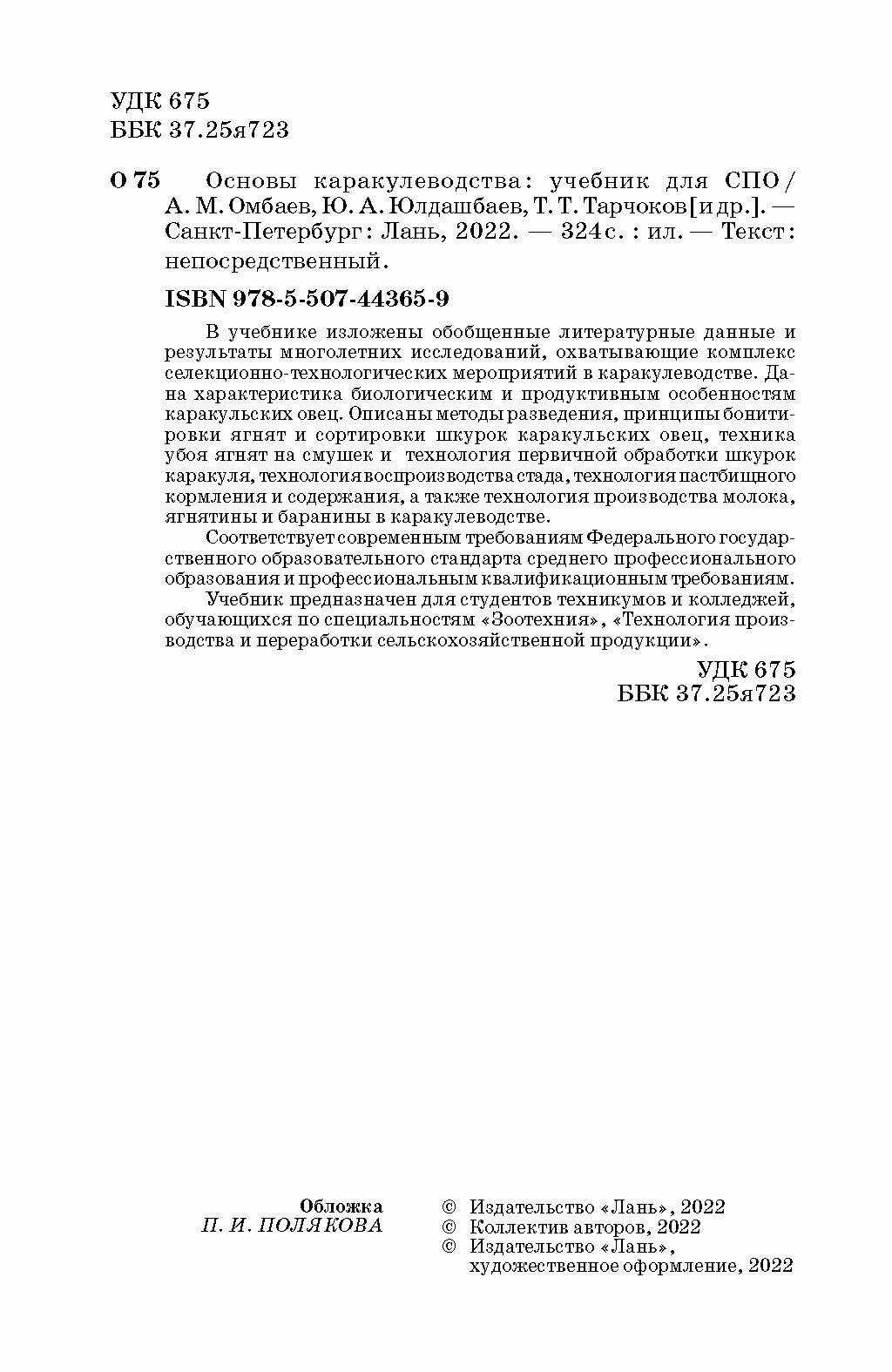 Основы каракулеводства. Учебник (Омбаев Абдирахман Молданазарулы, Юлдашбаев Юсупжан Артыкович, Тарчоков Тимур Тазретович); Лань, 2022