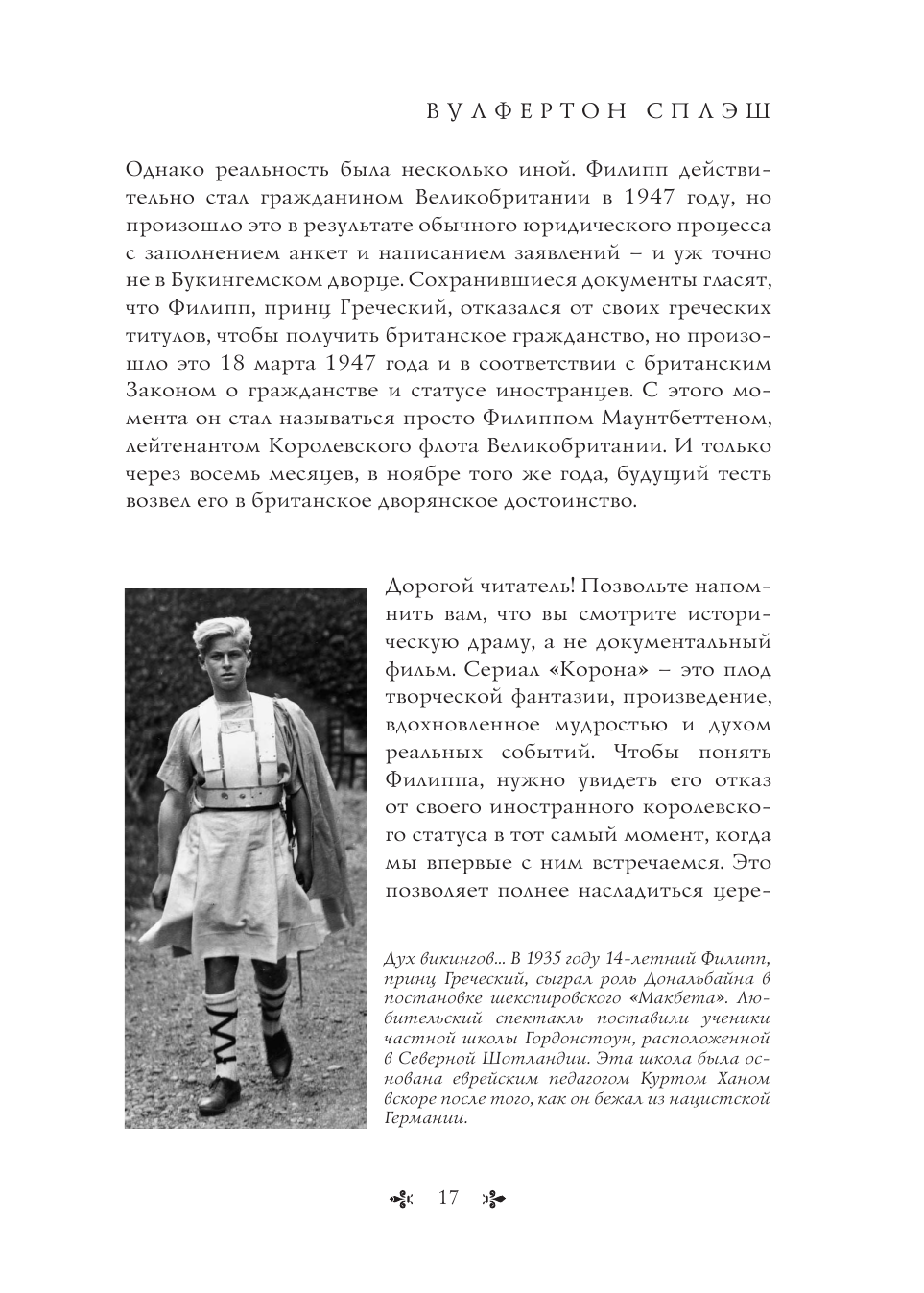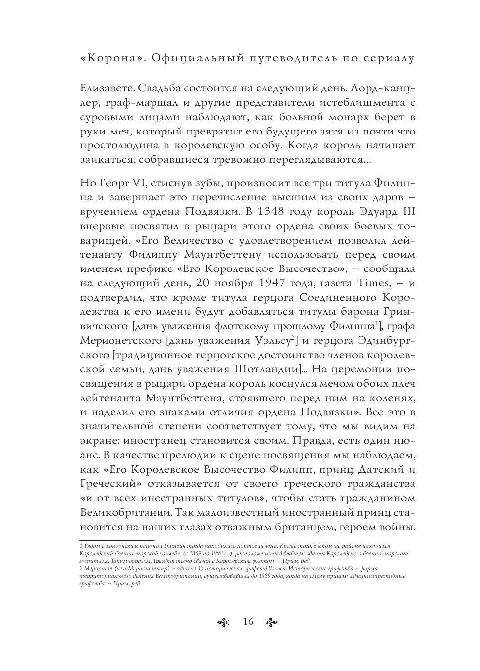 Эта книга, посвященная первым двум сезонам сериала, расскажет о том, как его создатели тщательно исследовали исторические факты и пытались искусно вплести в них художественный вымысел. Объяснит, что цель сериала - не только развлечь зрителя, но и показать на экране великих персонажей и масштабные темы, определявшие жизнь страны, а также раскрыть смысл необычных событий, происходивших в ее истории. Высшая сила давней и современной британской монархии заключается в ее способности вызывать искренние чувства - иногда злые и враждебные, чаще любопытные и восхищенные, но всегда чрезвычайно сентиментальные. Именно поэтому эта история уже много лет покоряет сердца телезрителей по всему миру - потому что каждый находит в ней не просто историю одной из величайших династий в истории, но и обычные проблемы, понятные всем. Помимо комментариев экспертов и объяснения некоторых неточностей в сериале книга содержит множество архивных фотографий, часть из которых читатели увидят впервые!