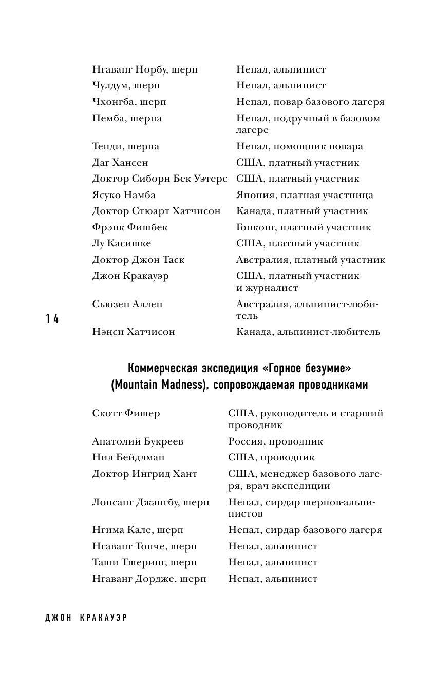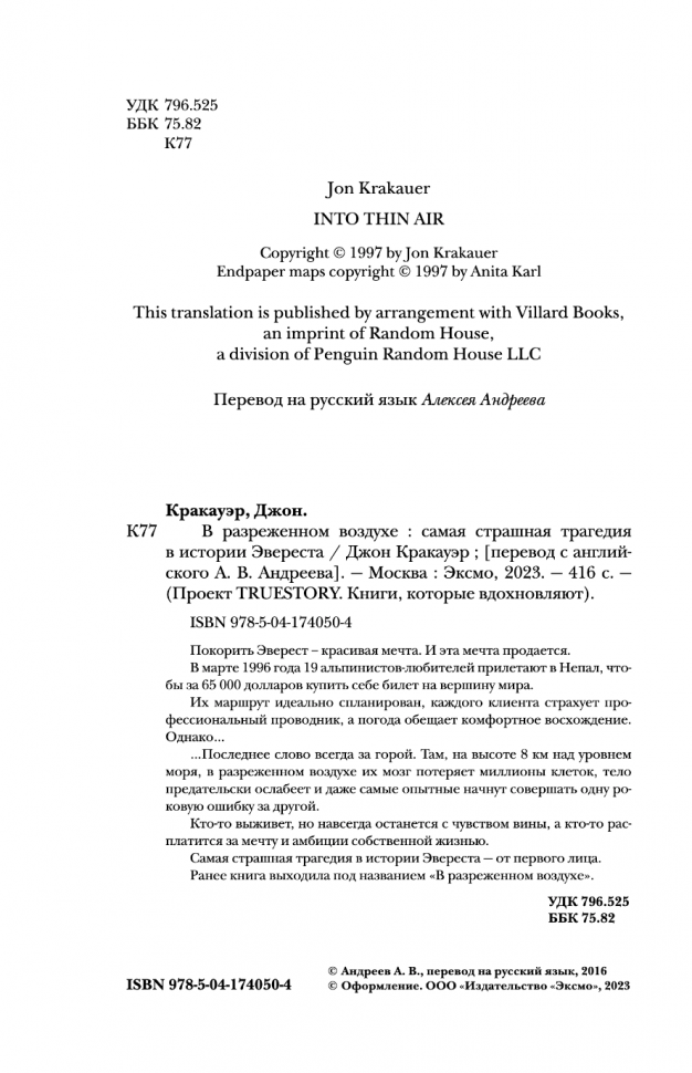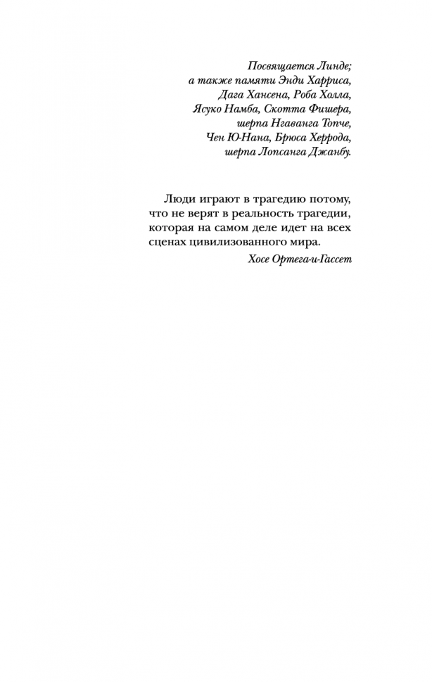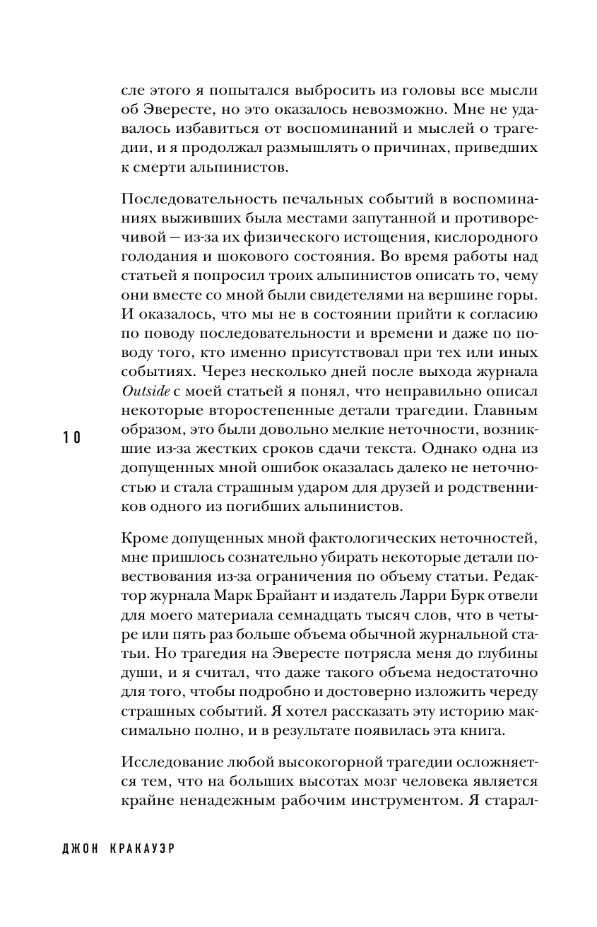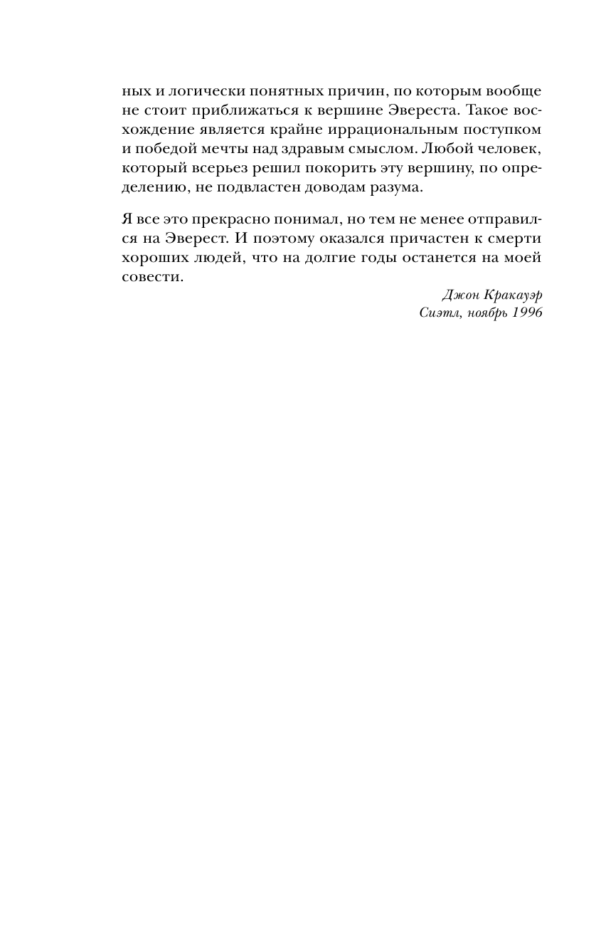 Книга интересная, написана от первого лица (что лично для меня всегда +). Конечно история субъективная и эмоциональная. Многие ругали и ругают этого автора. Но все-таки он писал то, что видел и то, что чувствовал. Безусловно у него были просчеты и ситуации, в которых он показал себя не в лучшем виде, было и то, что он не понимал.. однако его мнение имеет место быть. Читала книгу А. Букреева всем советую. После ее прочтения все становится на свои места. Что сказать... есть книга человека, покорившего 11 восьмитысячников и совершившего на них восхождение более 18 раз, человека, который спас людей в ужасных условиях и в одиночку.соверши немыслимый подвиг.. а есть книга Джона.. журналиста, альпиниста, человека, который писал статью про коммерциализацию Эвереста, человека который в 1996 году впервые попал на Эверест в качестве клиента, дошел до вершины..и написал книгу о том, что видел, что рассказали люди, которые остались в живых. Да, возможно, многое он не понимал ( в том числе почему А. Букреев быстро спустился с вершины, а не стал ждать своих клиентов), некоторые ситуации, в которых он мог бы помочь, он проигнорировал. Итог: есть две книги А. Букреева и Джона Кракауэра. Рекомендую прочитать обе.