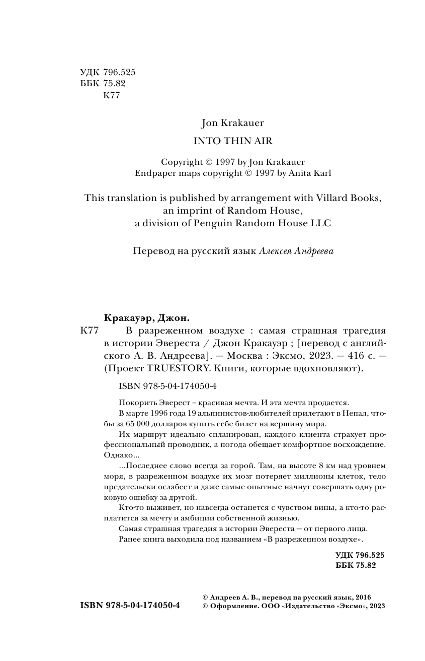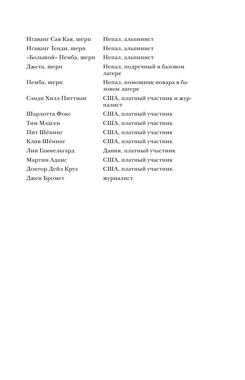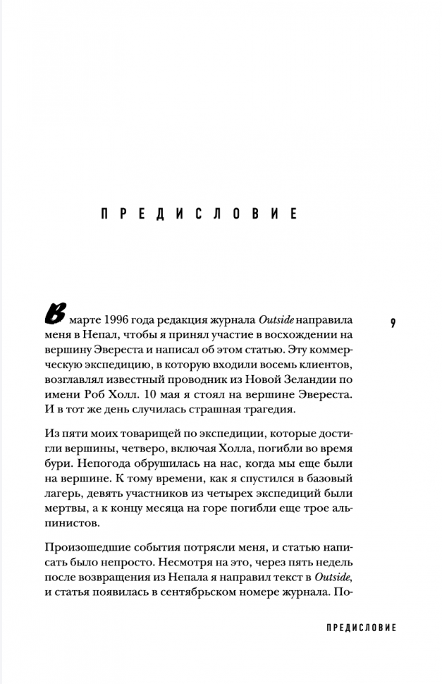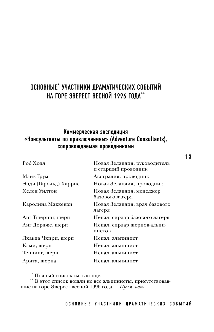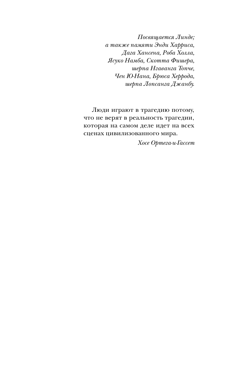 Книга интересная, написана от первого лица (что лично для меня всегда +). Конечно история субъективная и эмоциональная. Многие ругали и ругают этого автора. Но все-таки он писал то, что видел и то, что чувствовал. Безусловно у него были просчеты и ситуации, в которых он показал себя не в лучшем виде, было и то, что он не понимал.. однако его мнение имеет место быть. Читала книгу А. Букреева всем советую. После ее прочтения все становится на свои места. Что сказать... есть книга человека, покорившего 11 восьмитысячников и совершившего на них восхождение более 18 раз, человека, который спас людей в ужасных условиях и в одиночку.соверши немыслимый подвиг.. а есть книга Джона.. журналиста, альпиниста, человека, который писал статью про коммерциализацию Эвереста, человека который в 1996 году впервые попал на Эверест в качестве клиента, дошел до вершины..и написал книгу о том, что видел, что рассказали люди, которые остались в живых. Да, возможно, многое он не понимал ( в том числе почему А. Букреев быстро спустился с вершины, а не стал ждать своих клиентов), некоторые ситуации, в которых он мог бы помочь, он проигнорировал. Итог: есть две книги А. Букреева и Джона Кракауэра. Рекомендую прочитать обе.