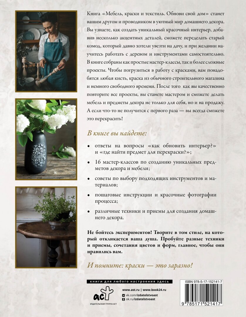 Книга "Мебель, краски и текстиль. Обнови свой дом" наполнена красочными иллюстрациями и пошаговыми инструкциями ко всем мастер-классам. Большой формат и качественная печать делают книгу отличным подарком для всех любителей домашнего уюта.