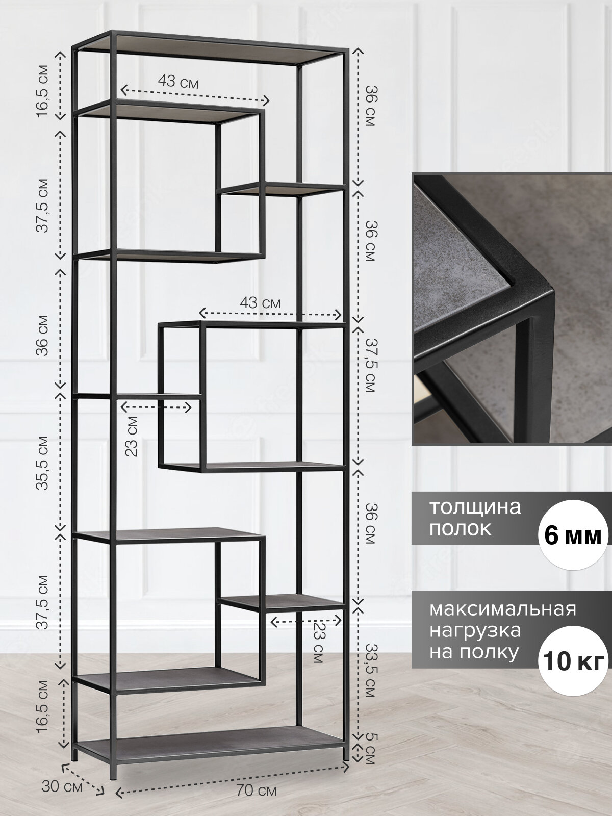 Стеллаж с полками под камень подойдет для зонирования пространства квартиры, загородного дома, офиса, студии и салона.