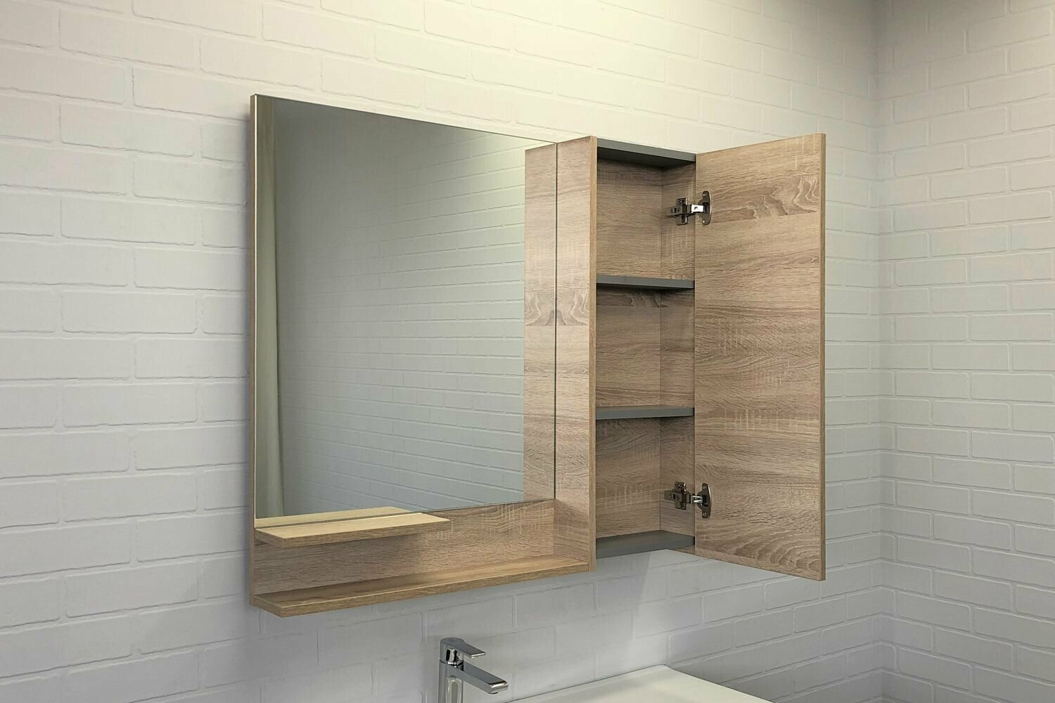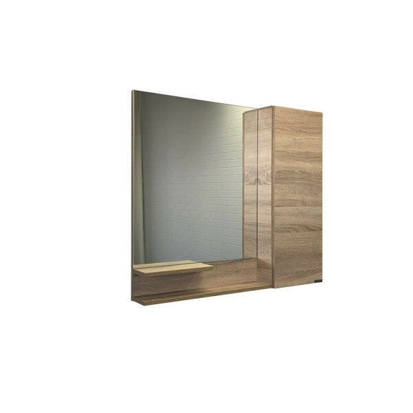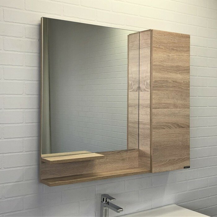 Зеркальный шкаф. Цвет-дуб сонома. Материал корпуса и фасада: влагостойкое ЛДСП. Габариты (ШхВхГ): 900*800*150 мм. Створка оснащена петлями с плавным закрыванием. За створкой две горизонтальные полки. Высококачественное зеркальное полотно с амальгамой на основе серебра. Удобные полочки для размещения принадлежностей для умывания. Дополнительно можно укомплектовать светильником