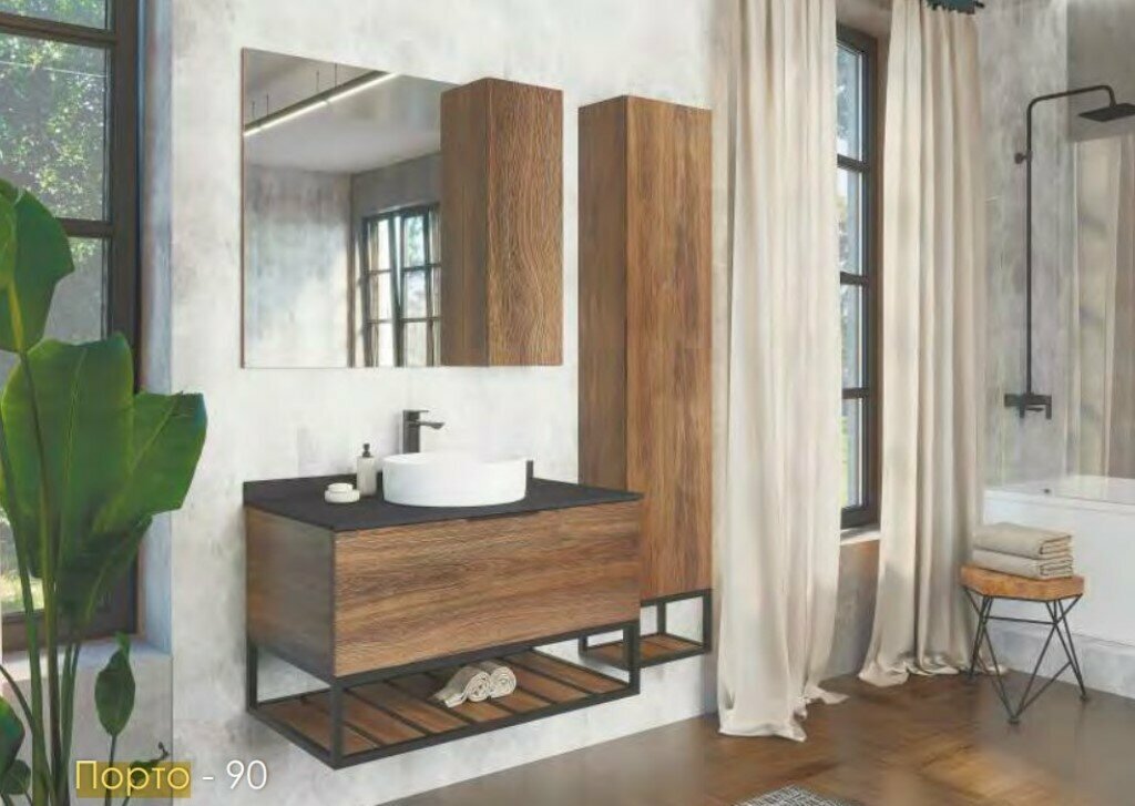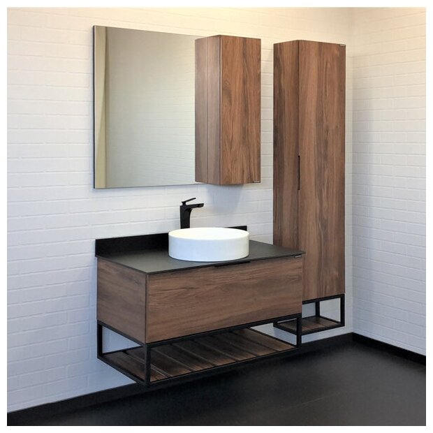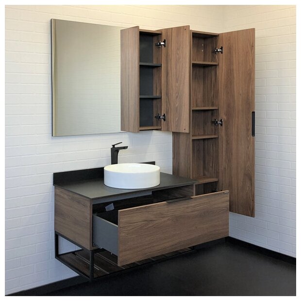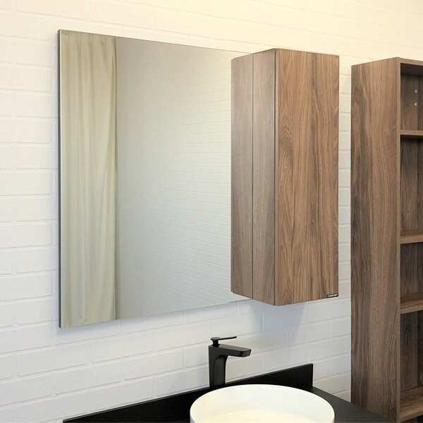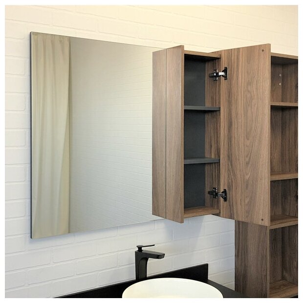 Зеркальный шкаф. Цвет-дуб темно коричневый. Зеркало для ванной комнаты с тремя створками. Створки оснащены петлями с плавным закрыванием. Высококачественное зеркальное полотно с амальгамой на основе серебра. Корпус шкафа из влагостойкого ЛДСП. Обе боковые створки зеркала открываются наружу. У средней центральной секции петли справа. За широкой створкой две горизонтальные полки, за узкими по одной. Габариты (ШхВхГ): 880*800*150 мм.