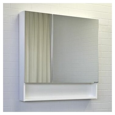 Зеркальный шкаф. Цвет-белый глянец. Створки оснащены петлями с плавным закрыванием. Высококачественное зеркальное полотно с амальгамой на основе серебра. Обе боковые створки зеркала открываются наружу. За широкой створкой две горизонтальные полки, за узкой одна. На нижней внешней полке можно расположить невысокие принадлежности для умывания. Габариты (ШхВхГ): 800*800*135 мм