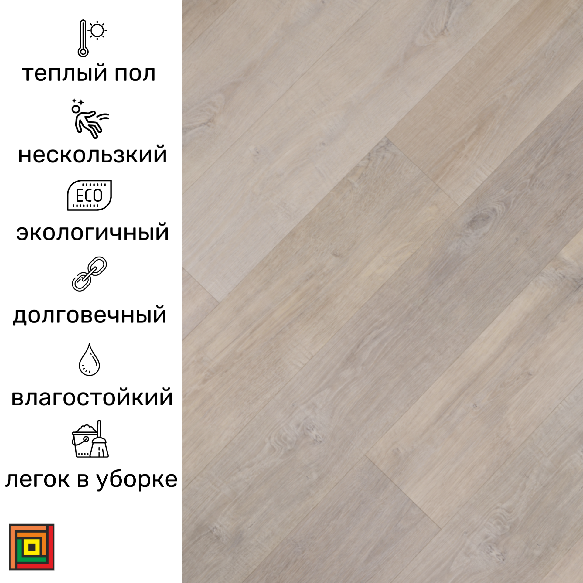 Прочное напольное покрытие для квартир и офисов. 100% водостойкое, не горит. Выдерживает передвижения мебели, острые каблуки, колёсики офисных кресел. С SPC напольного покрытия легко смываются следы от детских фломастеров или последствий вечеринки, достаточно протереть тряпочкой с водой или даже растворителем - например, если капнули краской во время ремонта. Он не выгорает на солнце и выдерживает перепады температуры на даче. Ламинат надёжен и удобен в эксплуатации. Кварц - винил - это композит, который не впитывает воду, а надёжные замки соединяют панели без щелей - вода не проникнет под ламинат. SPC напольное покрытие поглощает звуки: стук каблуков, цокот когтей собаки, шум от падения предметов. Кварцвинил безопасен для взрослых и детей, поэтому его кладут на пол в детских садах, больницах, бассейнах и ванных. Подложка уже в комплекте.