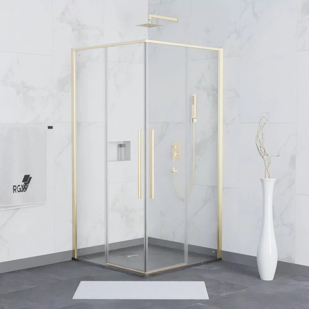 Душевой уголок RGW Stilvoll 100х100 32323100-16 золото. Стекло обрамлено цельной алюминиевой рамой. Модель имеет магнитный уплотнитель. Трап или поддон приобретается отдельно.