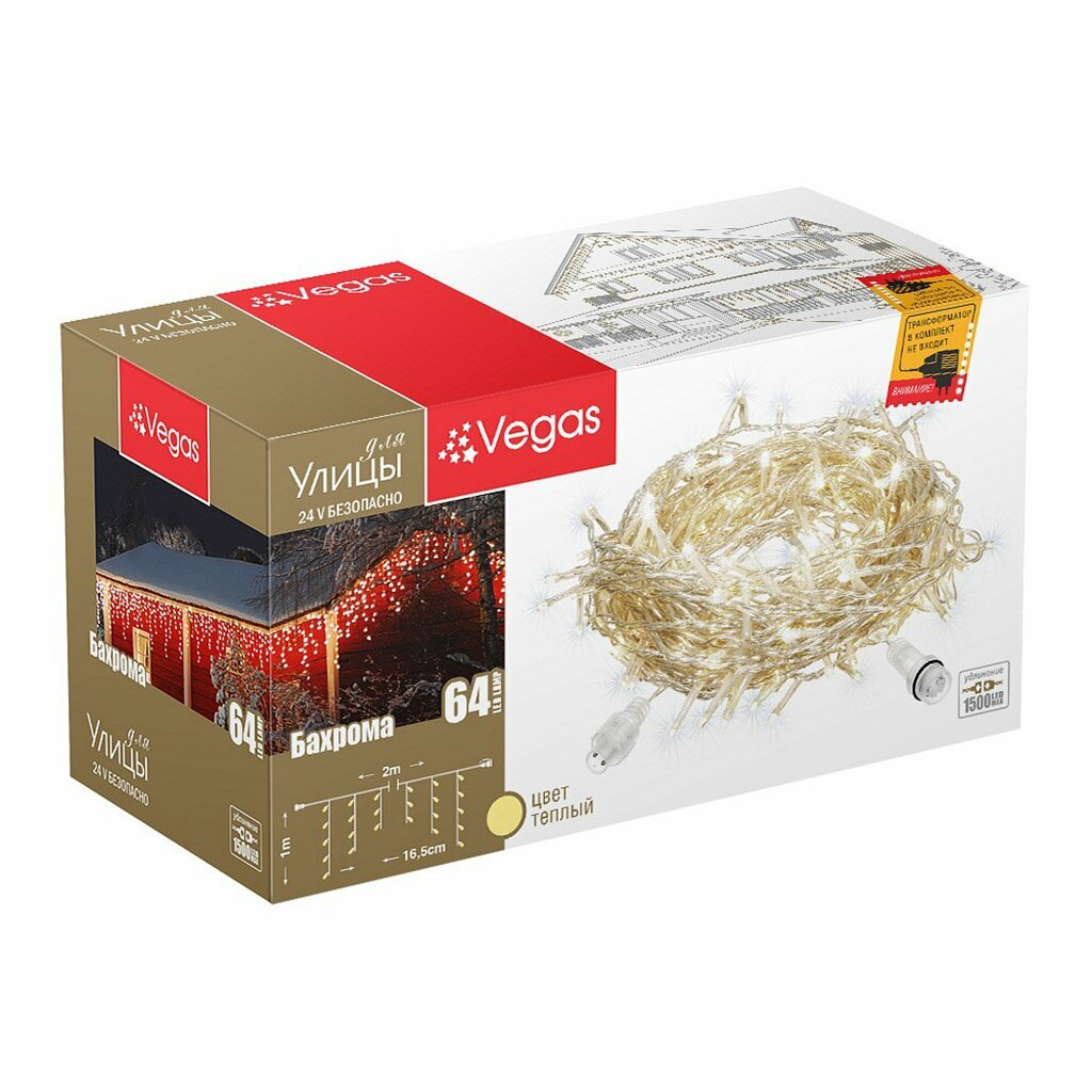 Сервис сравнения цен СкидкаГИД предлагает сравнить цены на товар «55012 VEGAS 24V Электрогирлянда-конструктор "Бахрома" 64 теплых LED ламп 12 нитей прозрачный провод 2*1 м /32/4»