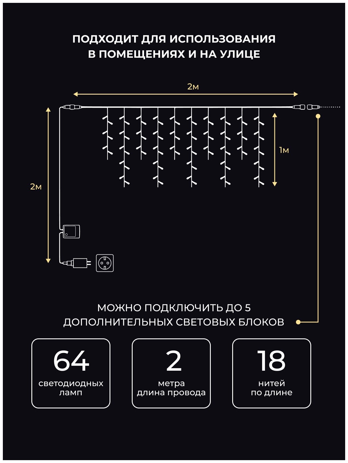 Для создания декоративной и праздничной иллюминации. Электрогирлянды "Бахрома" предназначены как для внешнего, так и для внутреннего декорирования (фасады зданий, карнизы, окна, колонны и др. архитектурные элементы, жилые и торговые помещения, елки, растения, предметы интерьера). Есть возможность последовательного соединения до 1 500 LED. Трансформатор НЕ входит в комплект! Приобретается отдельно.