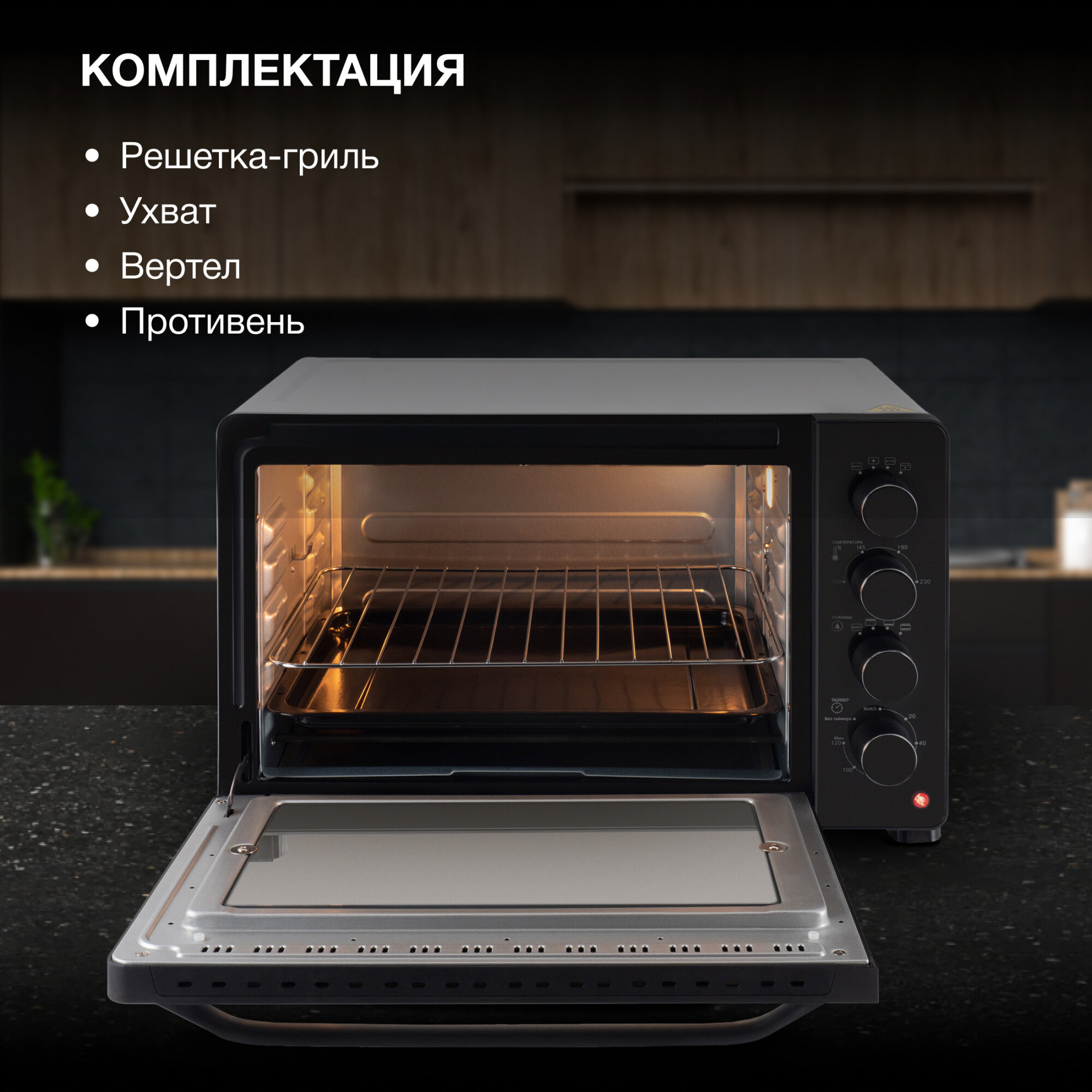 В комплекте поставляются: вертел и ручка для снятия вертела, прямоугольный противень и ухват для него, решётка для гриля. Также устройство оснащено удобным световым индикатором.