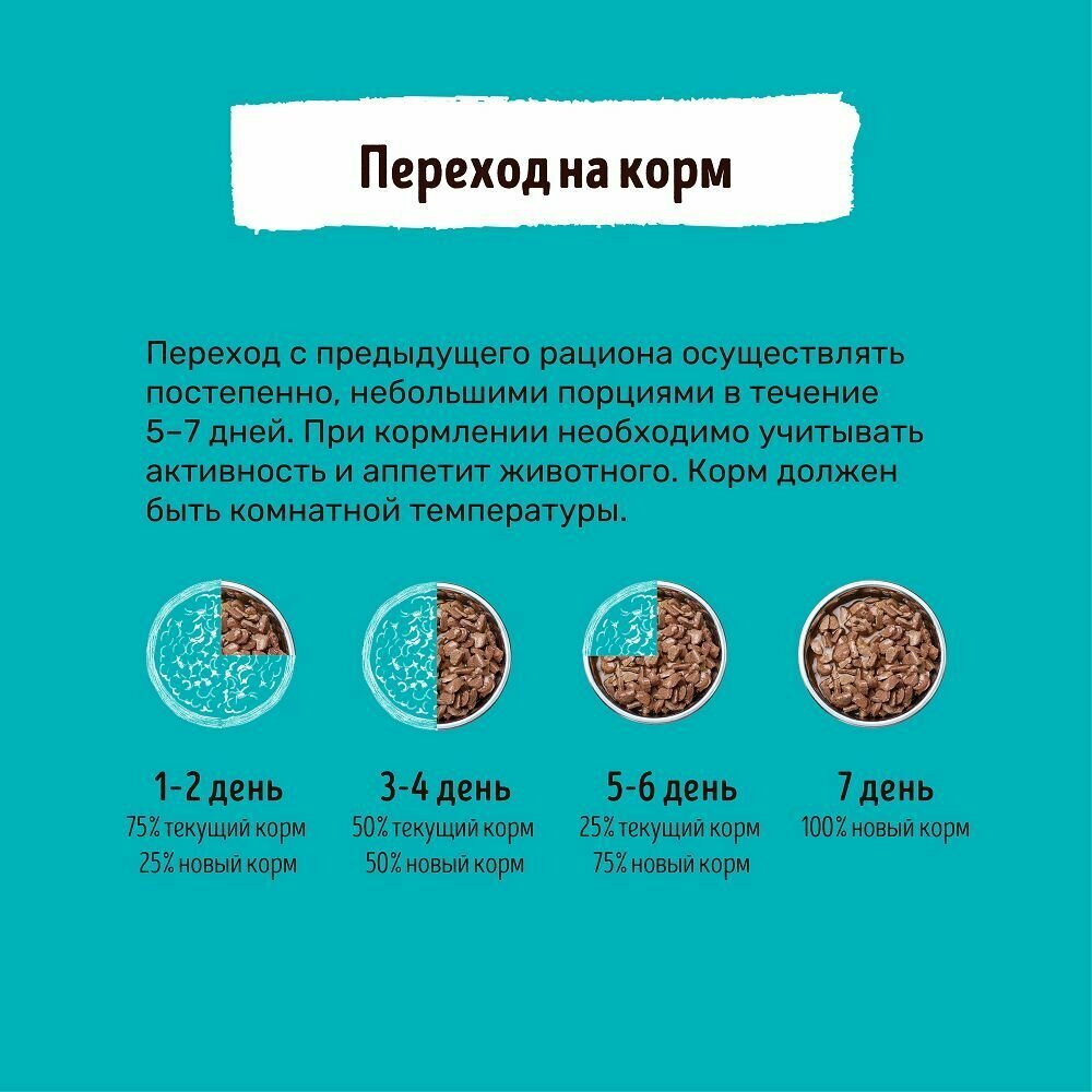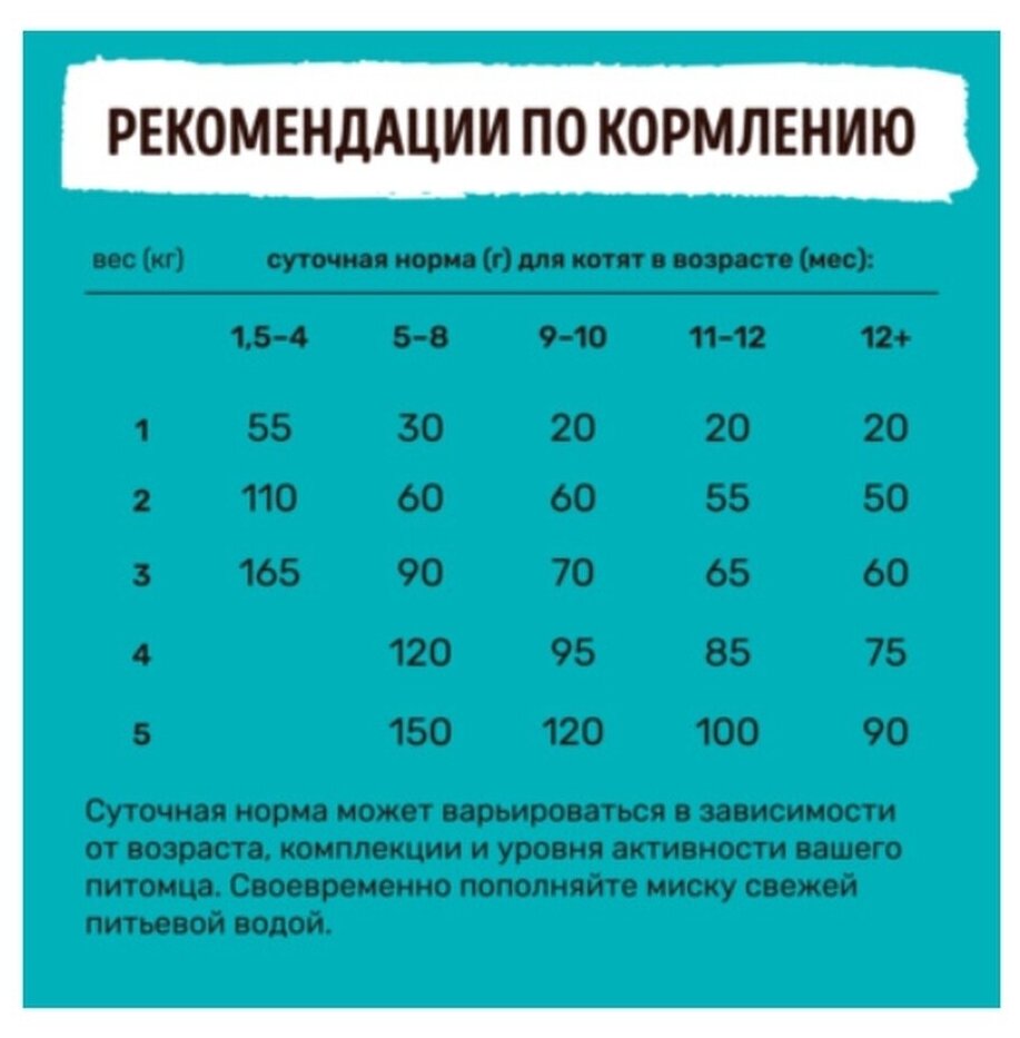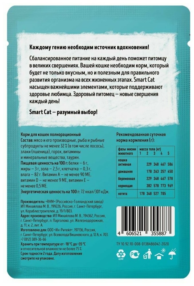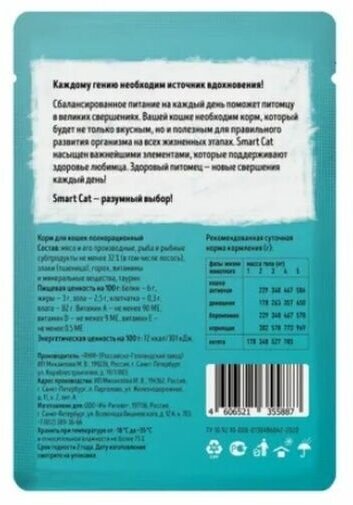 Изысканные вкусы паучей Smart Cat не оставят питомца равнодушным! Сбалансированный состав и нежнейшие кусочки отборного мяса сделают день вашей кошки неповторимым, а витамины минеральные вещества в составе помогут поддержать здоровье любимца на должном уровне. Рекомендации по кормлению вес (кг) суточная норма (г) для котят в возрасте (мес): 1.5 - 4 5-8 9-10 11-12 12+ 1 55 30 20 20 20 2 110 60 60 55 50 3 165 90 70 65 60 4 120 95 85 75 5 150 120 100 90 Суточная норма может варьироваться в зависимости от возраста, комплекции и уровня активности вашего питомца. Своевременно пополняйте миску свежей питьевой водой.