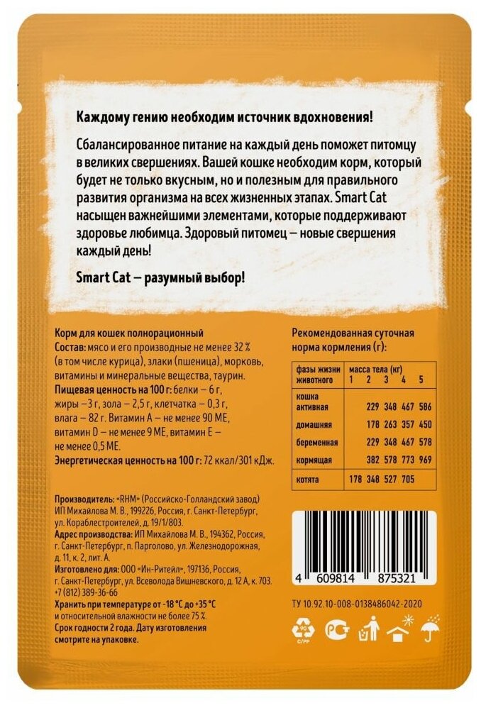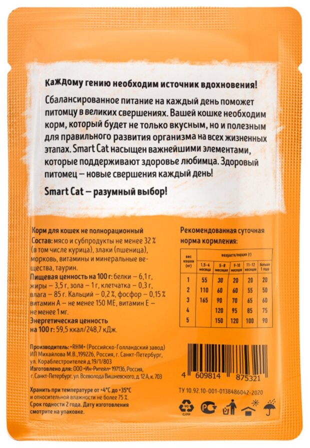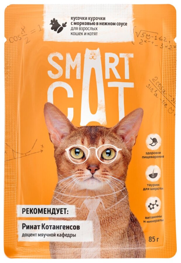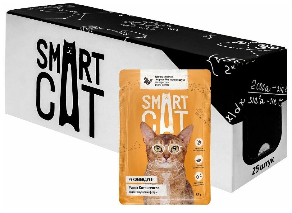 Влажный корм для кошек Smart Cat кусочки курочки с морковью в нежном соусе пауч 0085 кг курица, овощи 85 г