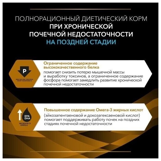 Корм консервированный полнорационный диетический для взрослых кошек для поддержания функции почек при поздней стадии хронической почечной недостаточности. Содержит ограниченное количество высококачественного белка, а также ограниченное количество фосфора, с повышенным содержанием омега-3 жирных кислот. Данный корм обладает высокой вкусовой привлекательностью для кошек со сниженным аппетитом.