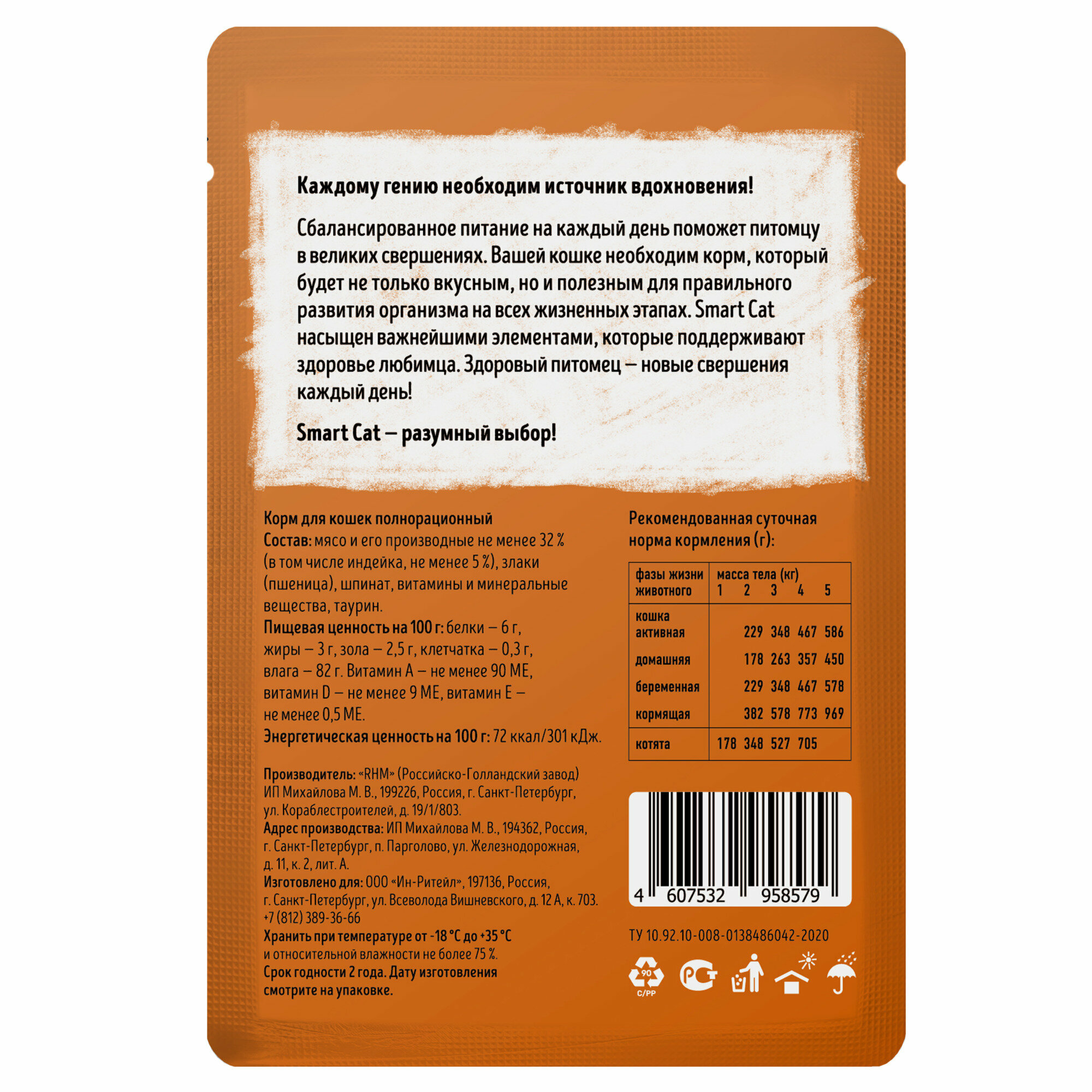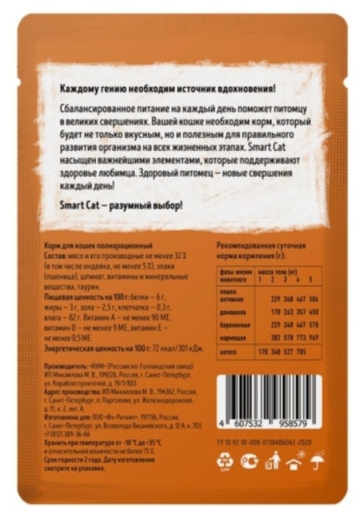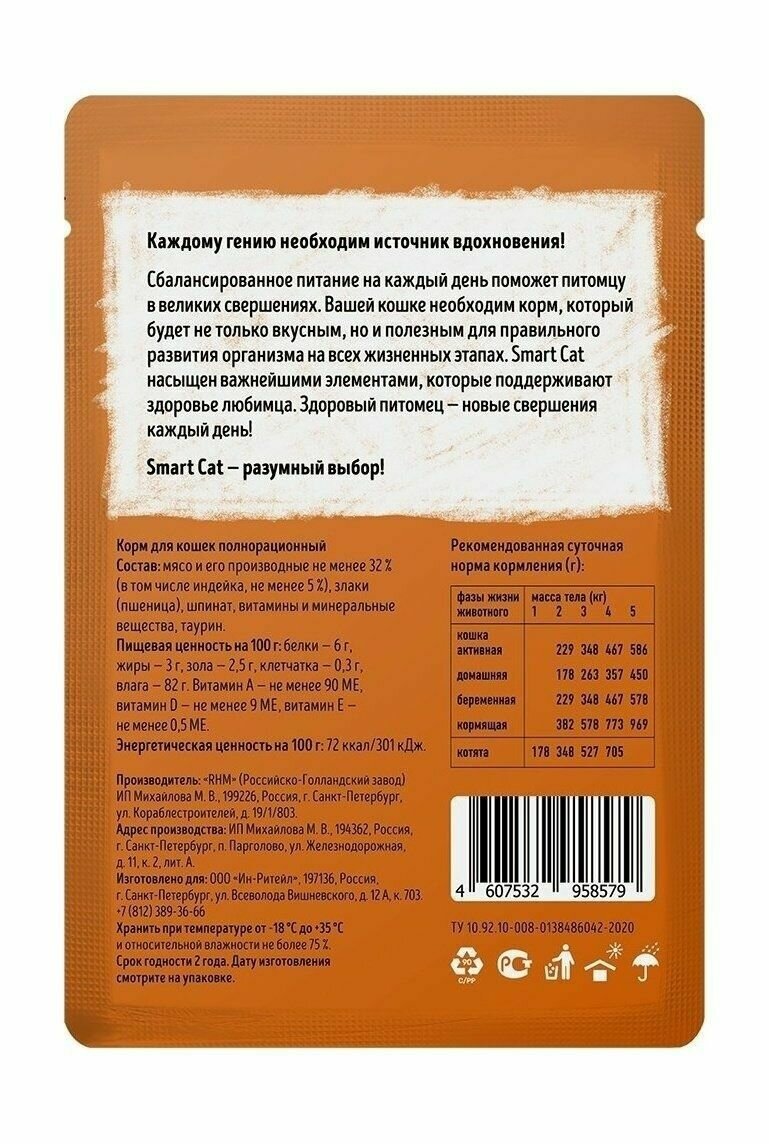 Изысканные вкусы паучей Smart Cat не оставят питомца равнодушным. Сбалансированный состав и нежнейшие кусочки отборного мяса сделают день вашей кошки неповторимым, а витамины минеральные вещества в составе помогут поддержать здоровье любимца на должном уровне. Ингредиенты: мясо и субпродукты не менее 36% (в том числе индейка, не менее 3,2%), злаки (пшеница), шпинат, витамины и минеральные вещества, таурин. Пищевая ценность (100г): белки - 8,0 г, жиры - 2,7 г, зола - 1,2 г, клетчатка - 0,2 г, влага - 85,0 г. Кальций - 0,2 %, фосфор - 0,15 %. Витамин А - не менее 150 МЕ, витамин Е - не менее 1 мг. Энергетическая ценность (на 100г): 55,9 ккал/233,5 кДж.
